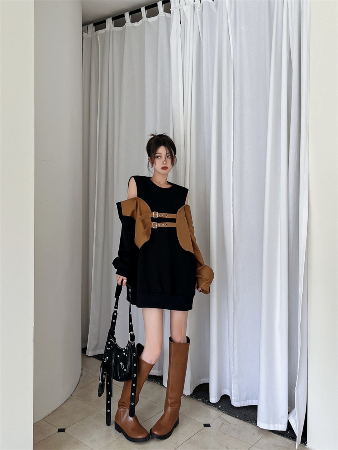 sense niche off-the-shoulder stitching fake two-piece autumn new mid-length loose long-sleeved sweater jacket top women ロング オータム 秋物 ステッチ nana98241840471 | modepoisson