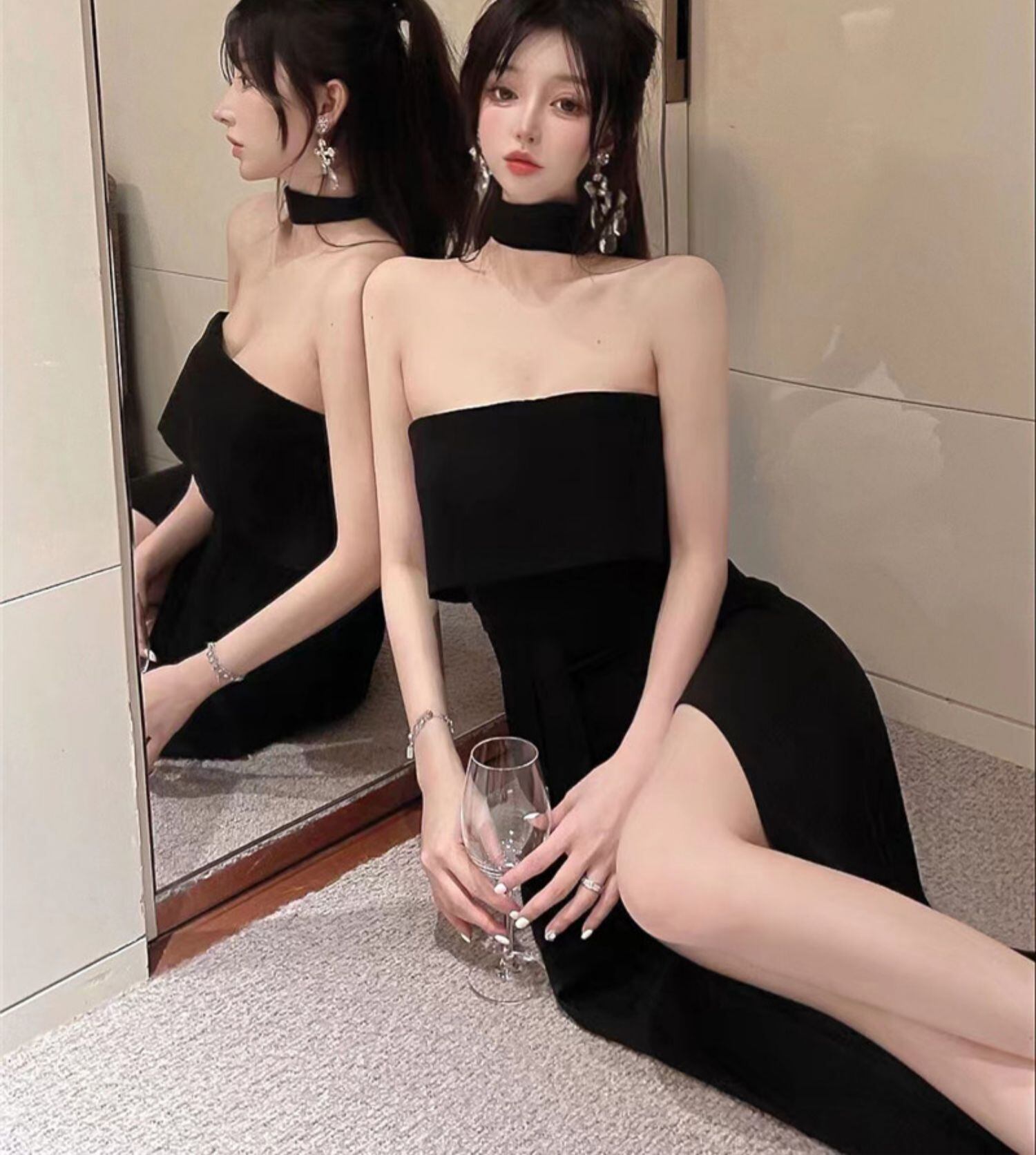 French temperament one-shoulder black tube top long skirt 2022 summer new slit waist dress women's clothing ロング ブラック サマー 夏物 スカート nana27317224584 | modepoisson