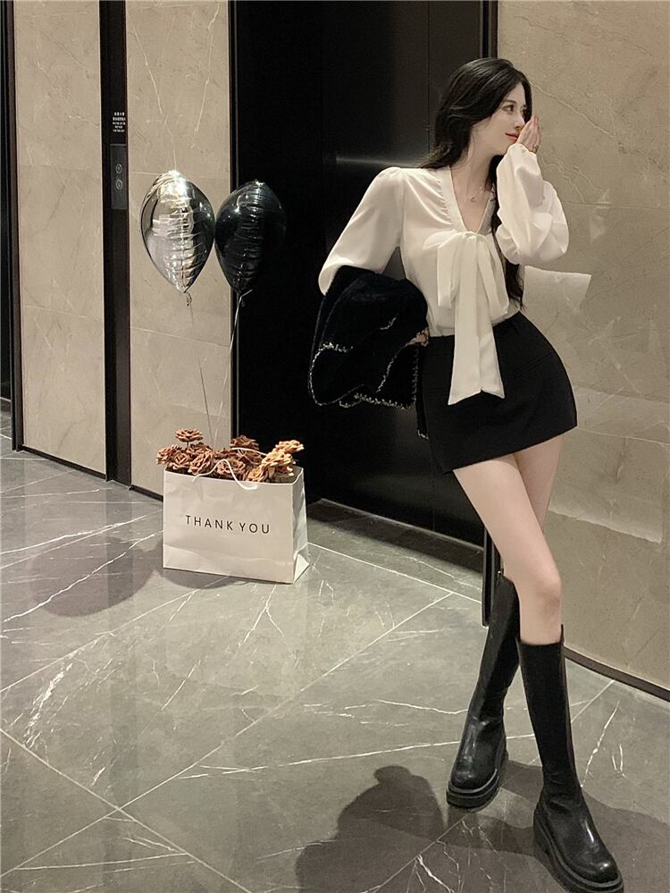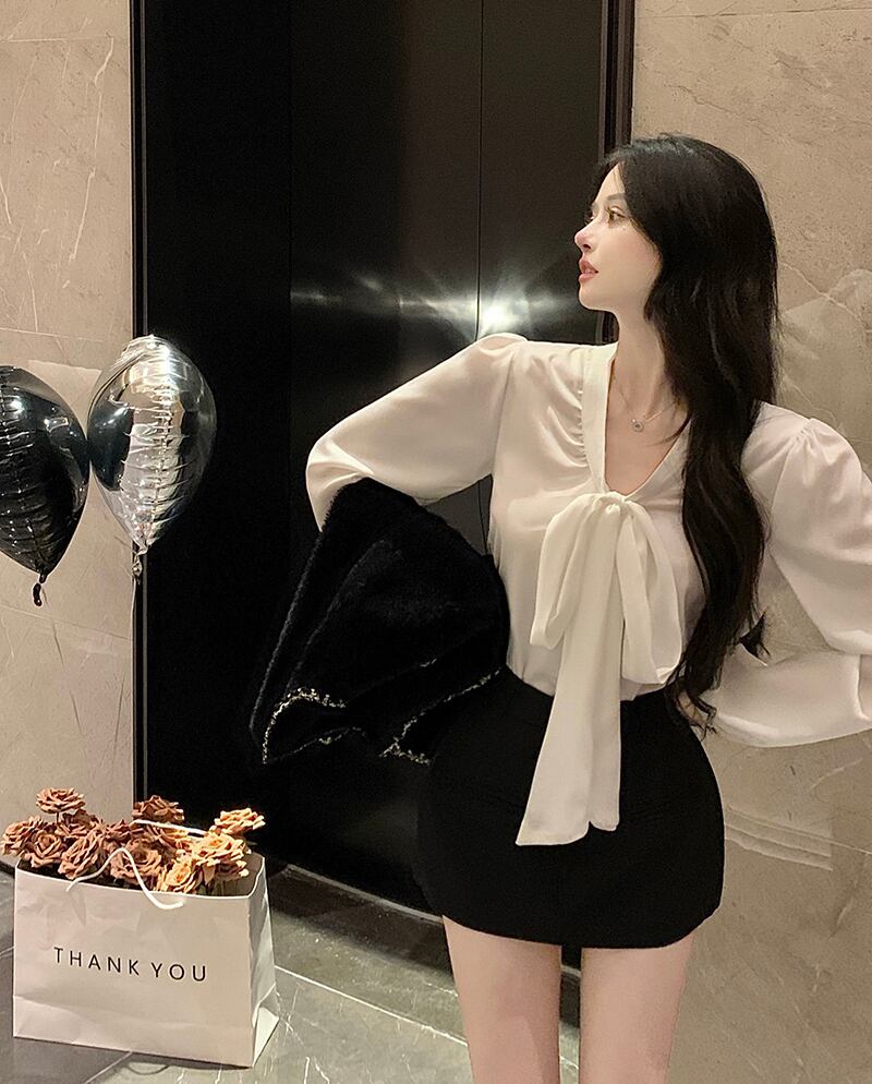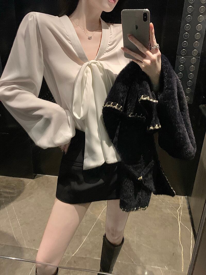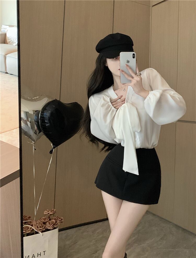Loose chiffon bow design small chic white shirt 2022 early autumn new long-sleeved top women ロング ホワイト シフォン リボン オータム 秋物 nana29855902382 | modepoisson