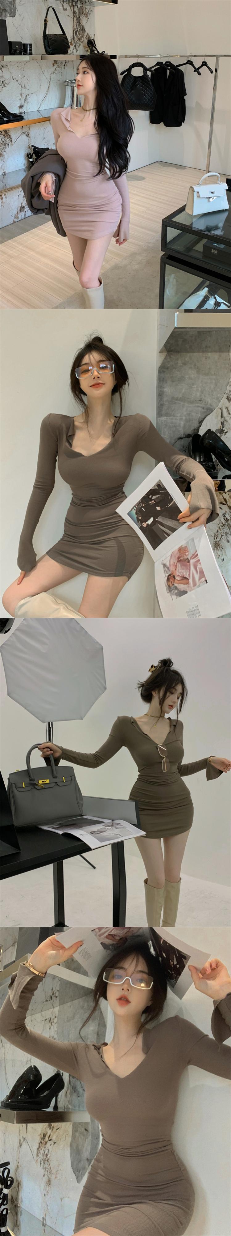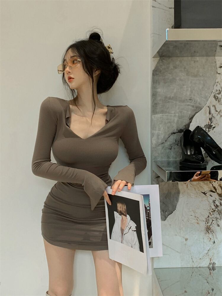 Pure desire sexy v-neck knitted bag hip tight slim dress women's 2022 early autumn new long-sleeved short skirt ショート ロング オータム 秋物 スカート Vネック スリム nana42875038292 | modepoisson