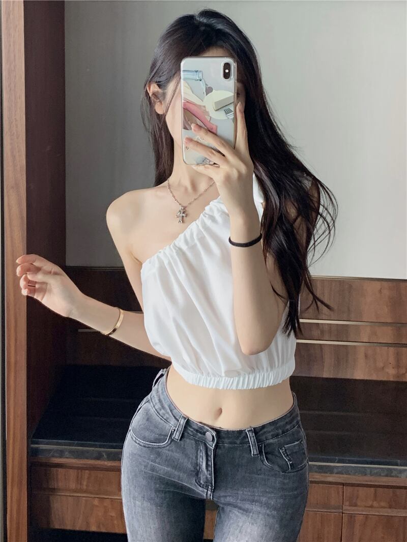 White top pure desire style summer outer wear French chic off-shoulder slanted shoulder short camisole vest women's clothing ショート ホワイト サマー 夏物 オフショルダー ピュア nana82616059900 | modepoisson