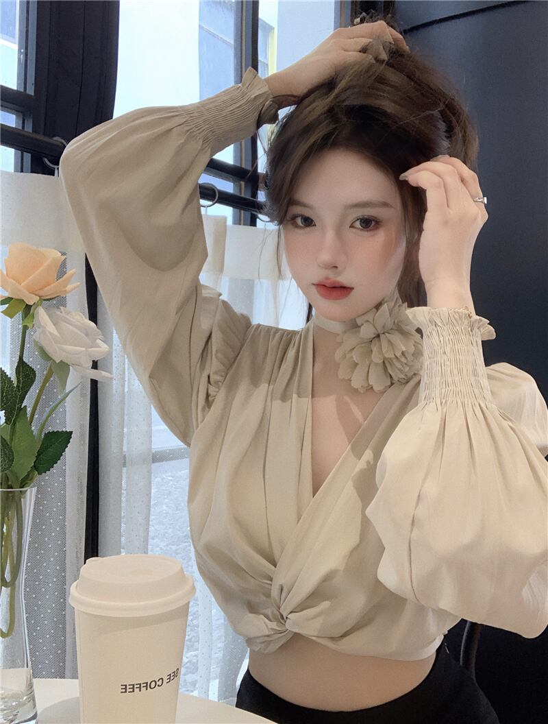 Early autumn French design sense niche short v-neck cross sexy puff sleeve halter shirt long-sleeved top women's clothing ショート ロング オータム 秋物 Vネック nana55178820432 | modepoisson