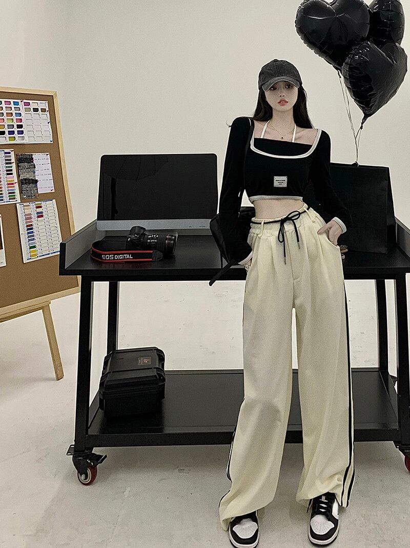 Autumn suit female 2022 new fashion temperament short top high waist casual wide leg pants two-piece set ハイウェスト ショート カジュアル オータム 秋物 ワイドレッグ ワイドパンツ nana60446989499 | modepoisson
