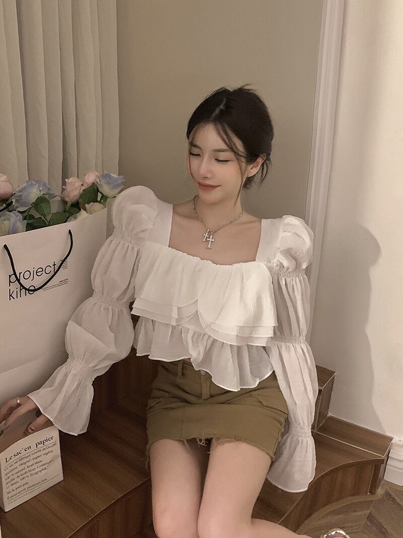sense niche top 2022 summer new ruffled square neck chiffon puff sleeves short long-sleeved shirt women ショート ロング シフォン サマー 夏物 スクウェア nana85110065215 | modepoisson
