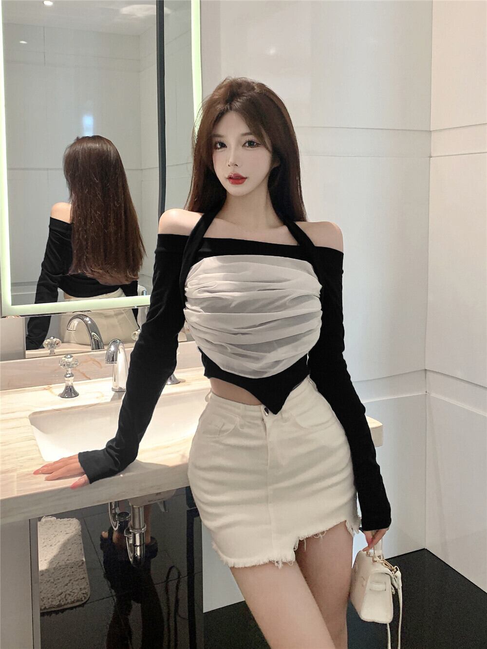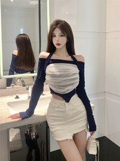 2022 early autumn new long-sleeved french one-shoulder design small unique unique t-shirt short top women ショート ロング オータム 秋物 Tシャツ nana21799915643 | modepoisson