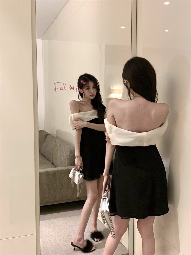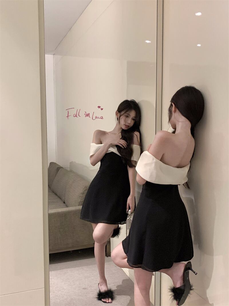 One-shoulder acetate dress women's 2022 new waist high-quality small French strapless black dress ブラック nana55793082552 | modepoisson