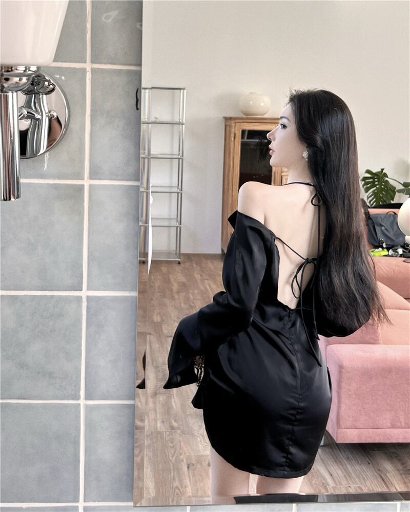 French temperament halter neck v-neck dress women's 2022 early autumn new waist sexy long-sleeved little black dress ロング ブラック オータム 秋物 Vネック nana35936295974 | modepoisson