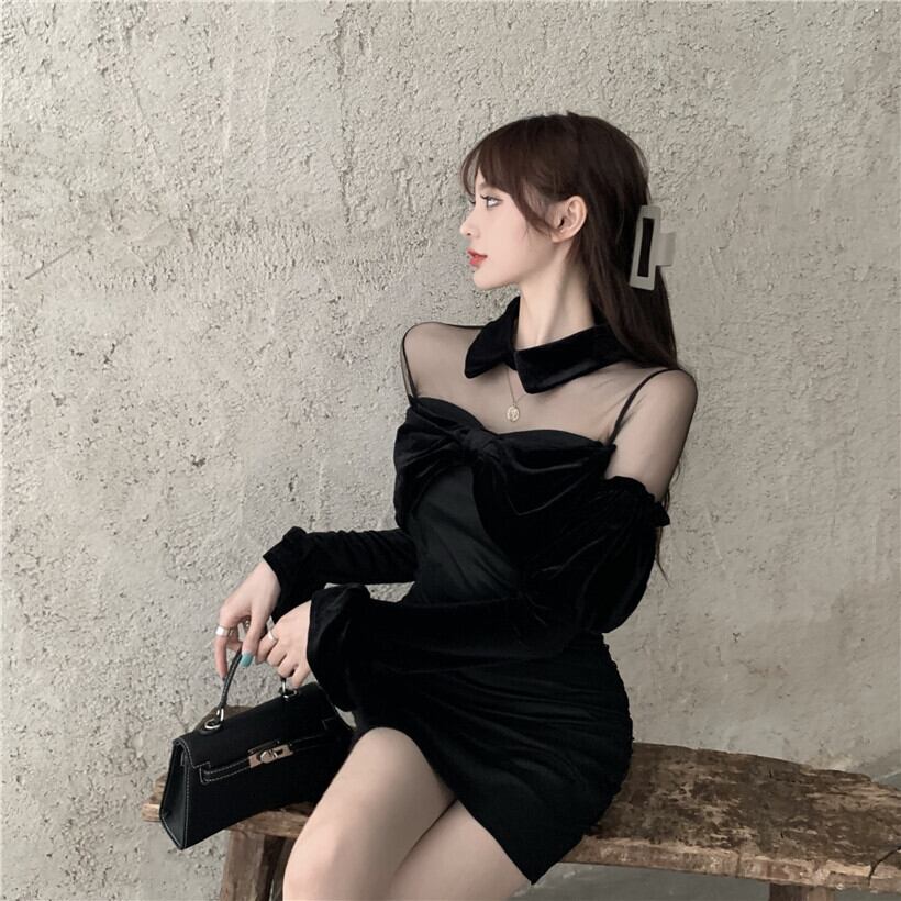 Hepburn style sexy gold velvet skirt autumn stitching mesh temperament ladies slim bottoming long-sleeved dress female ロング オータム 秋物 メッシュ スカート スリム ステッチ nana3931640371 | modepoisson