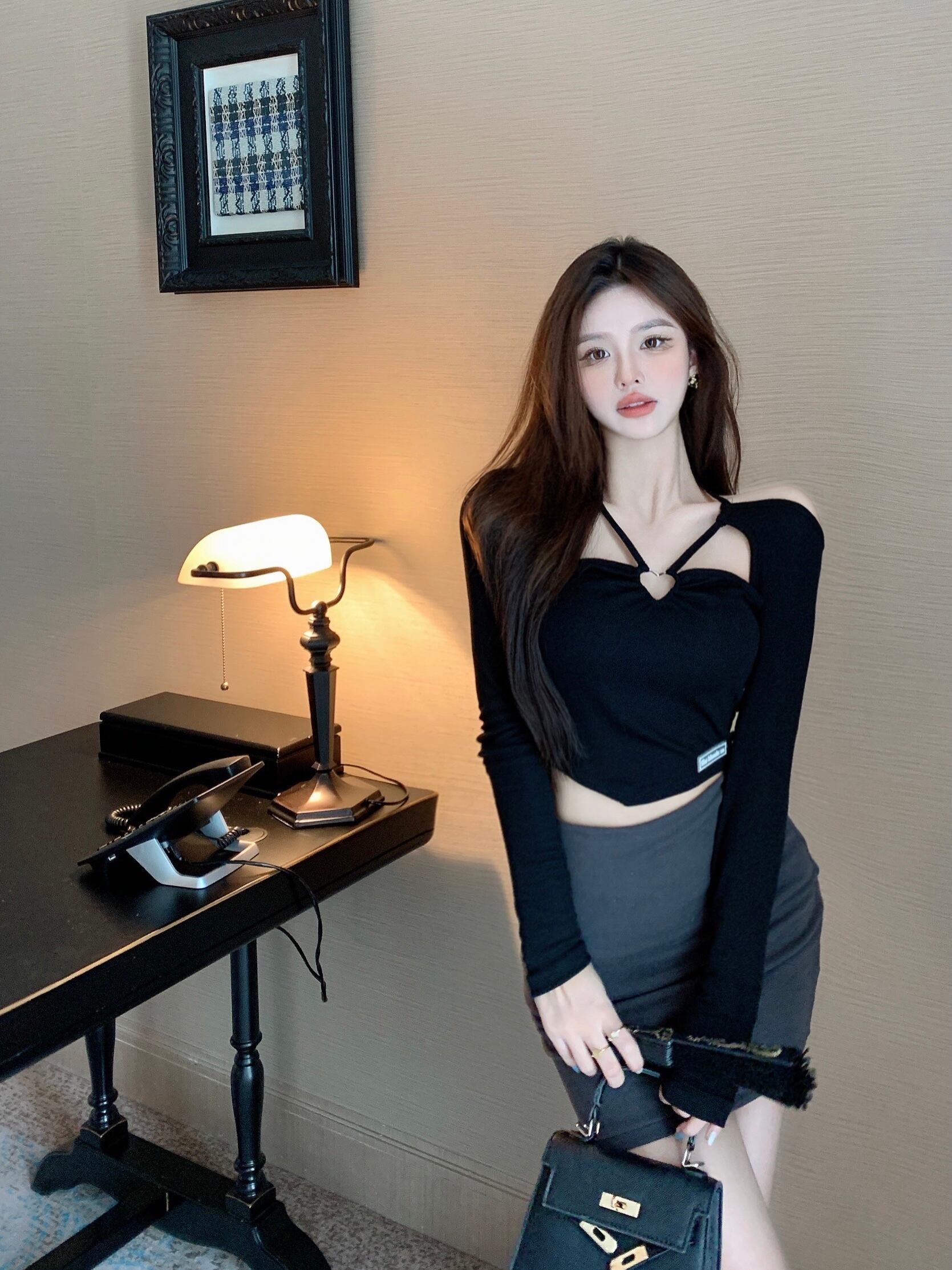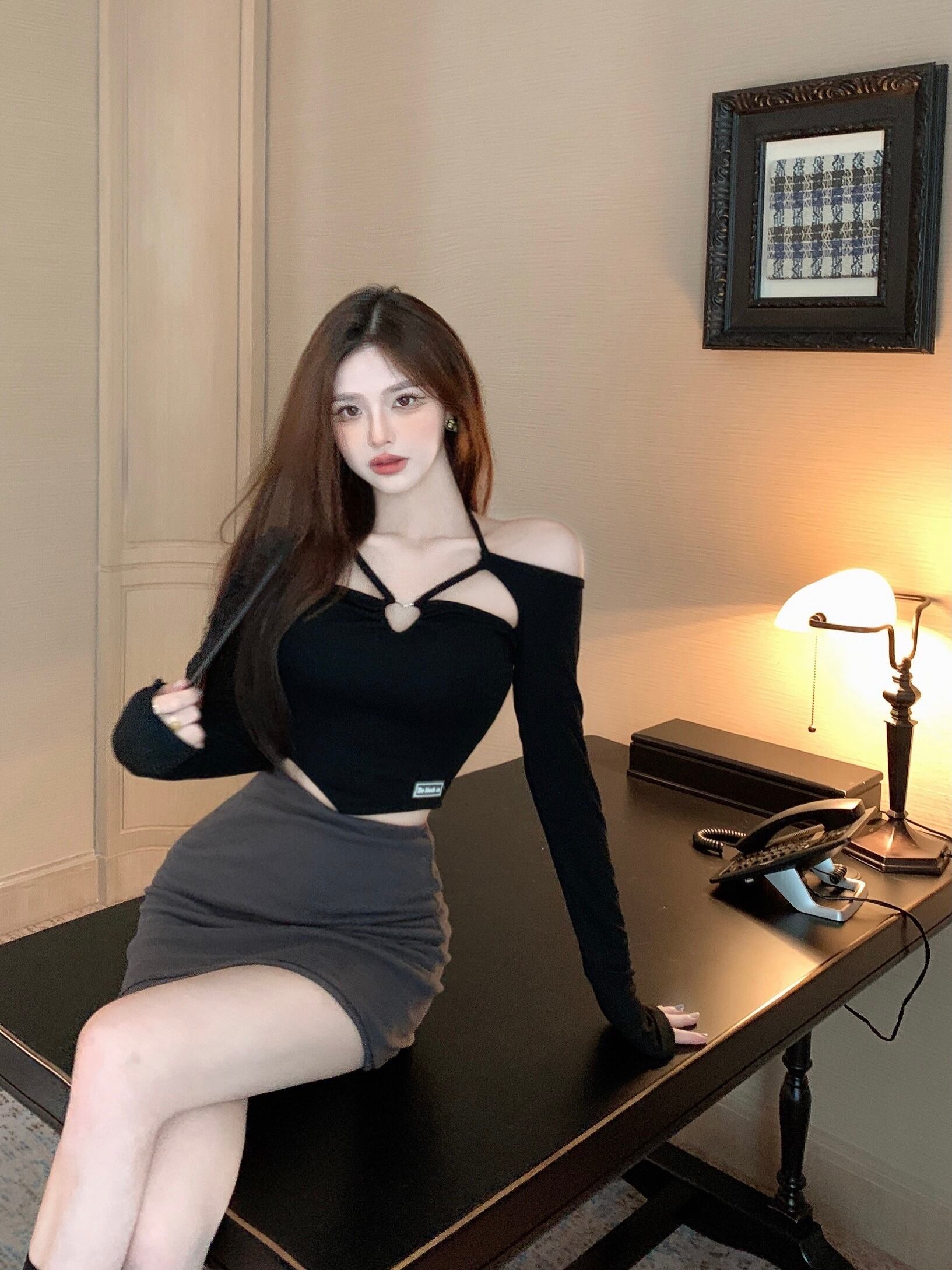 Black hollow off-shoulder t-shirt women's 2022 early autumn new design niche chic short long-sleeved top ショート ロング ブラック オータム 秋物 オフショルダー Tシャツ nana77079665611 | modepoisson