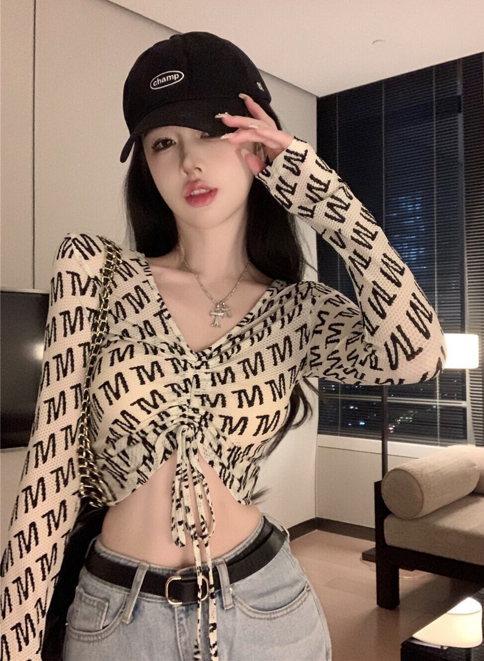 Short drawstring t-shirt women's 2022 early autumn new design niche chic unique navel sexy top ショート オータム 秋物 Tシャツ nana60270575108 | modepoisson