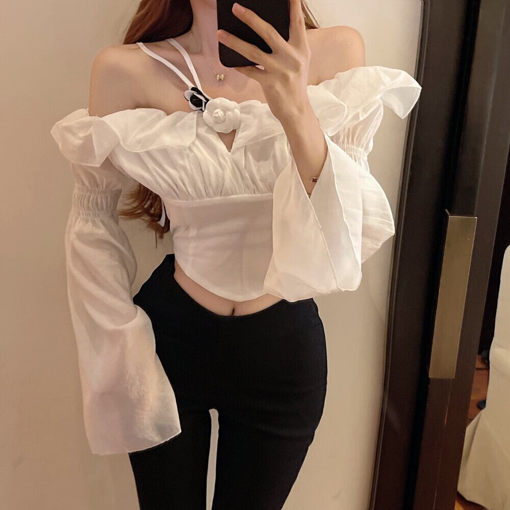 French design sense niche ruffled one-shoulder top 2022 early autumn new short long-sleeved shirt women's clothing ショート ロング オータム 秋物 nana89578275165 | modepoisson