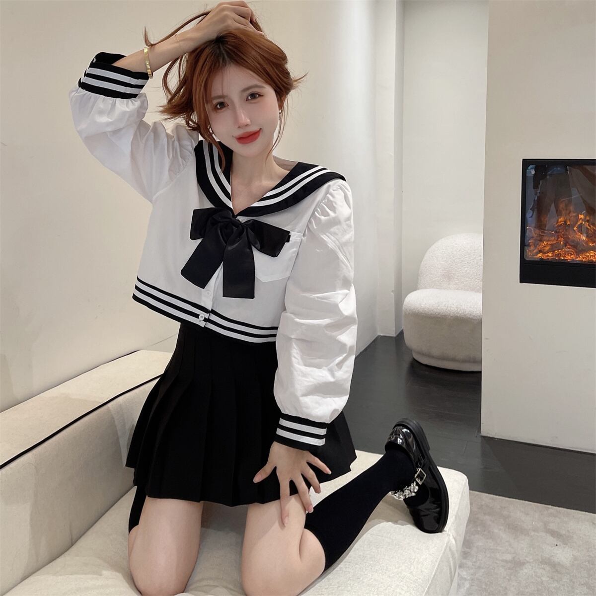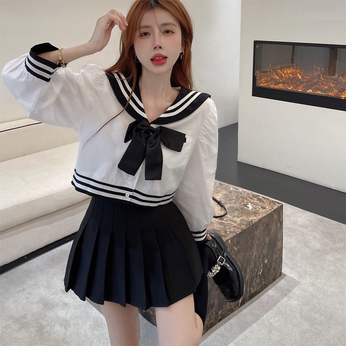 色:ネイビー襟shirt,ブラックpleatedスカート