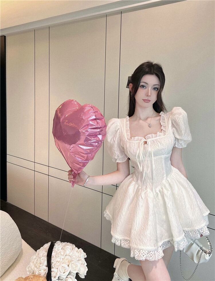 French puff sleeves waist princess short skirt 2022 summer new chic stunning white dress women ショート ホワイト サマー 夏物 スカート nana79041857020 | modepoisson