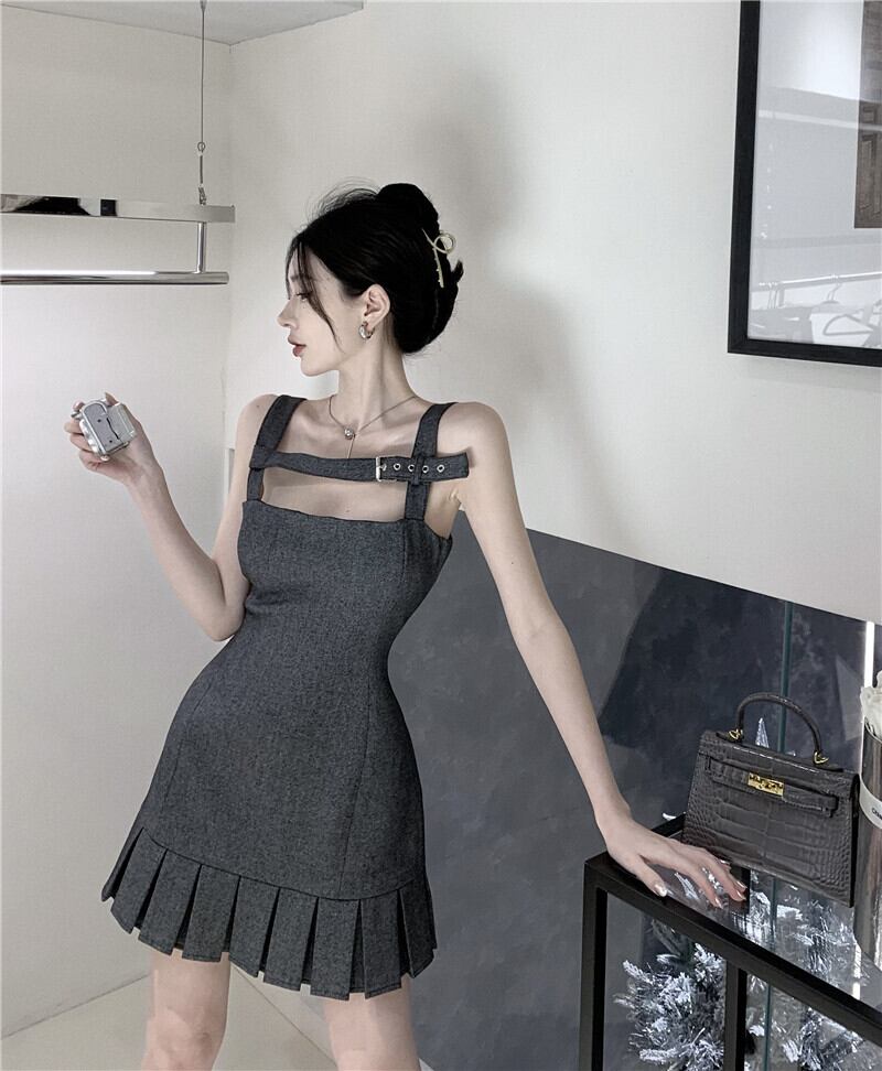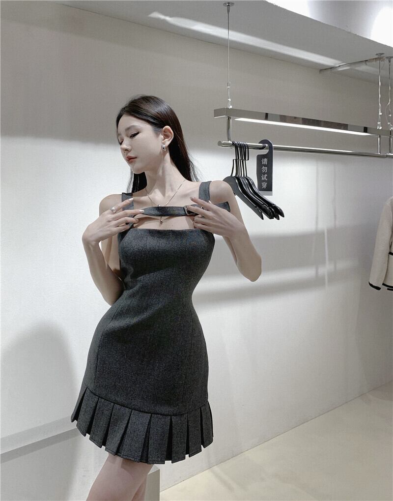 グレーのスリング プリーツ ドレス女性の夏の新しいフレンチ スタイルのニッチな気質アメリカの甘くてスパイシーなスリムなスカート 大人ガーリー スウィート キュート カジュアル サマー 夏物 nana33678985371 | modepoisson