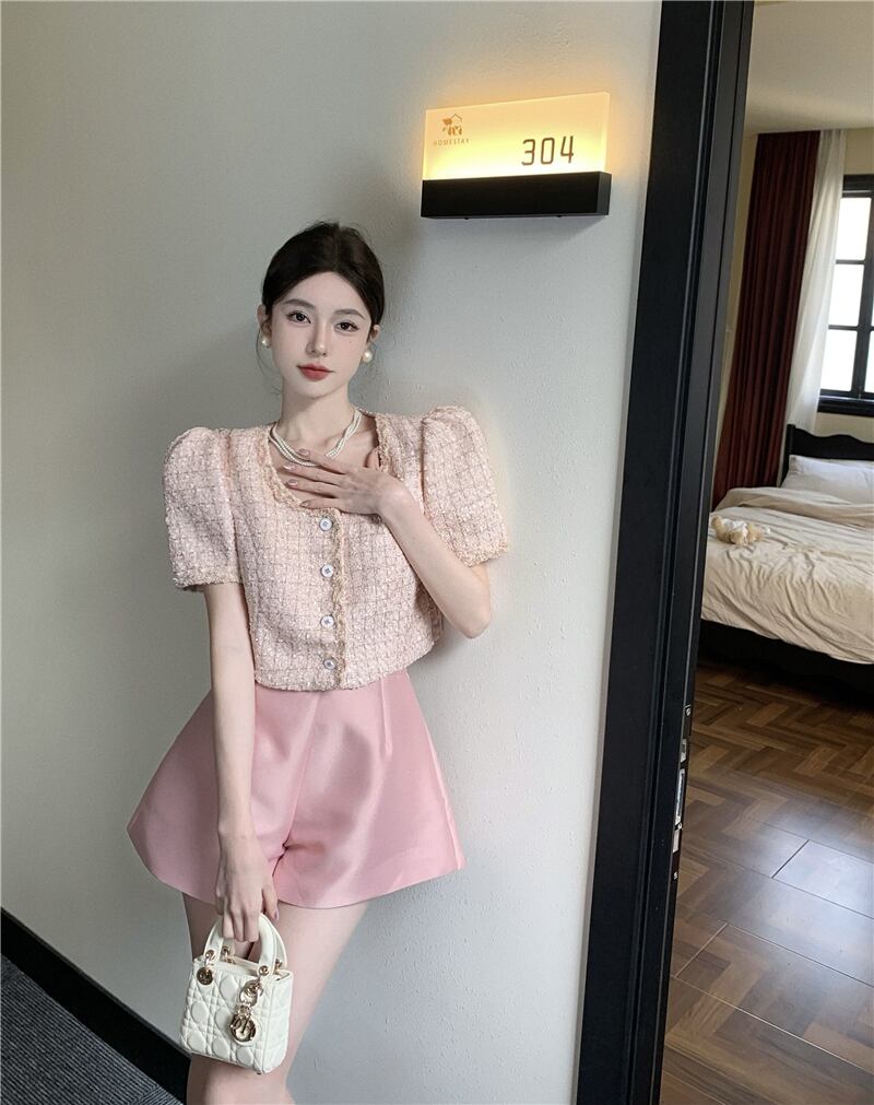 小さな香りのスーツの女性の夏の新しいファッション有名人の気質の半袖ジャケットハイウエストカジュアルワイドレッグパンツ2点セット ハイウェスト サマー 夏物 nana56587950025 | modepoisson