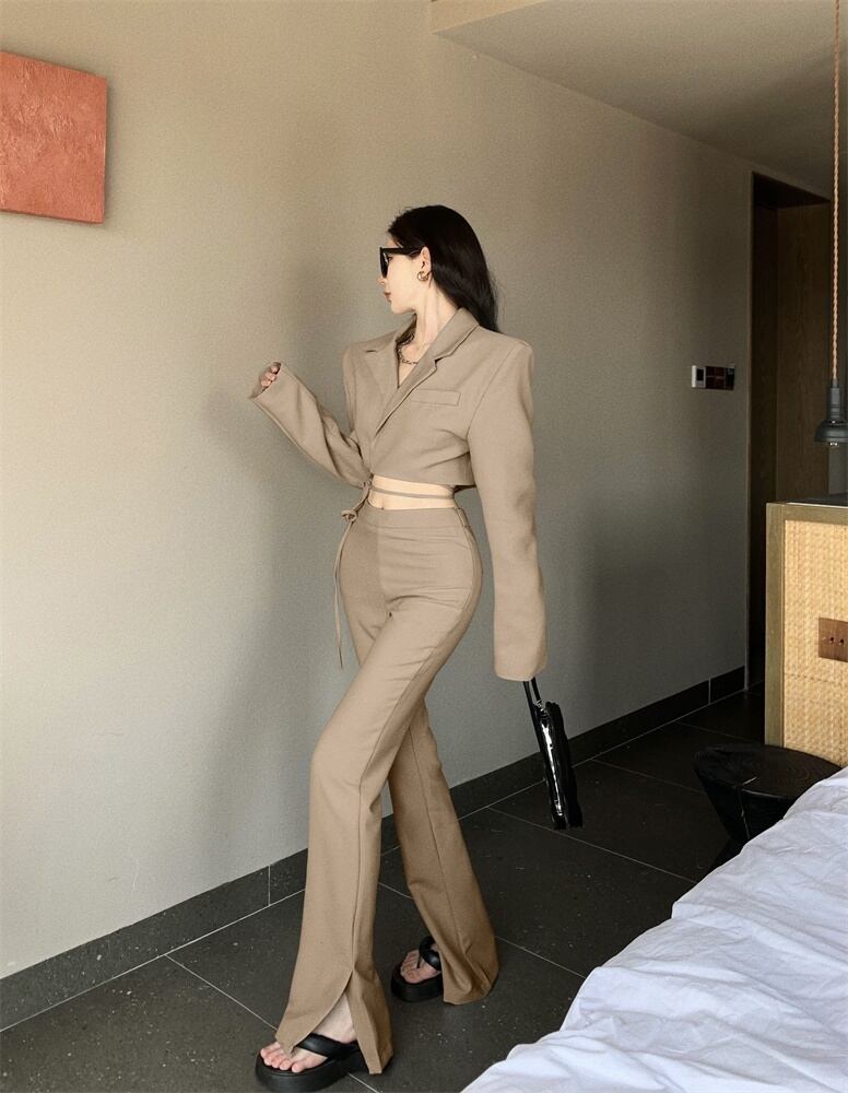ソルトライト調理揚げストリートツーピーススーツ女性 2023 春の新ファッションスーツジャケットスリムフィットスリットフレアパンツ レッド スプリング 春物 nana23261656669 | modepoisson