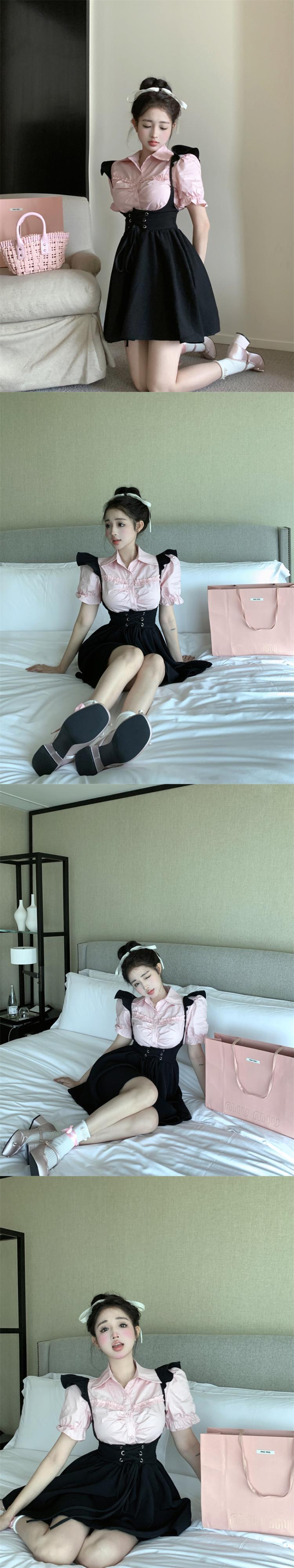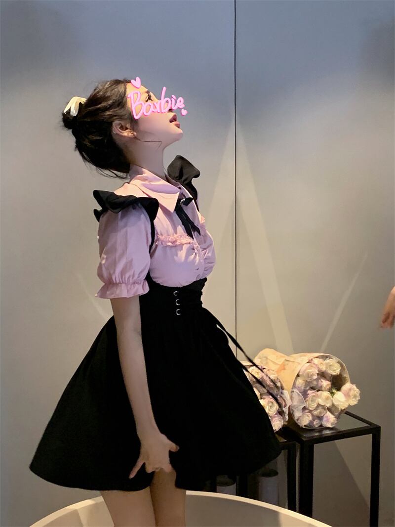 夏のスーツシャツファッション気質ストラップ黒サスペンダードレスソルトシリーズライト調理風揚げストリートツーピース女性 ブラック サマー 夏物 nana18847713999 | modepoisson
