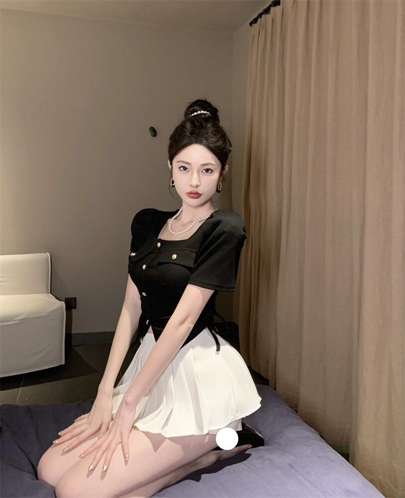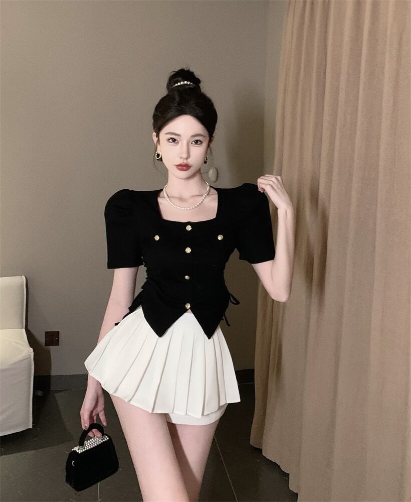 フレンチスクエアカラーパフスリーブショートトップハイウエストプリーツスカートパンツファッション気質夏新ツーピーススーツ女性 ハイウェスト サマー 夏物 スクウェア nana83793433167 | modepoisson