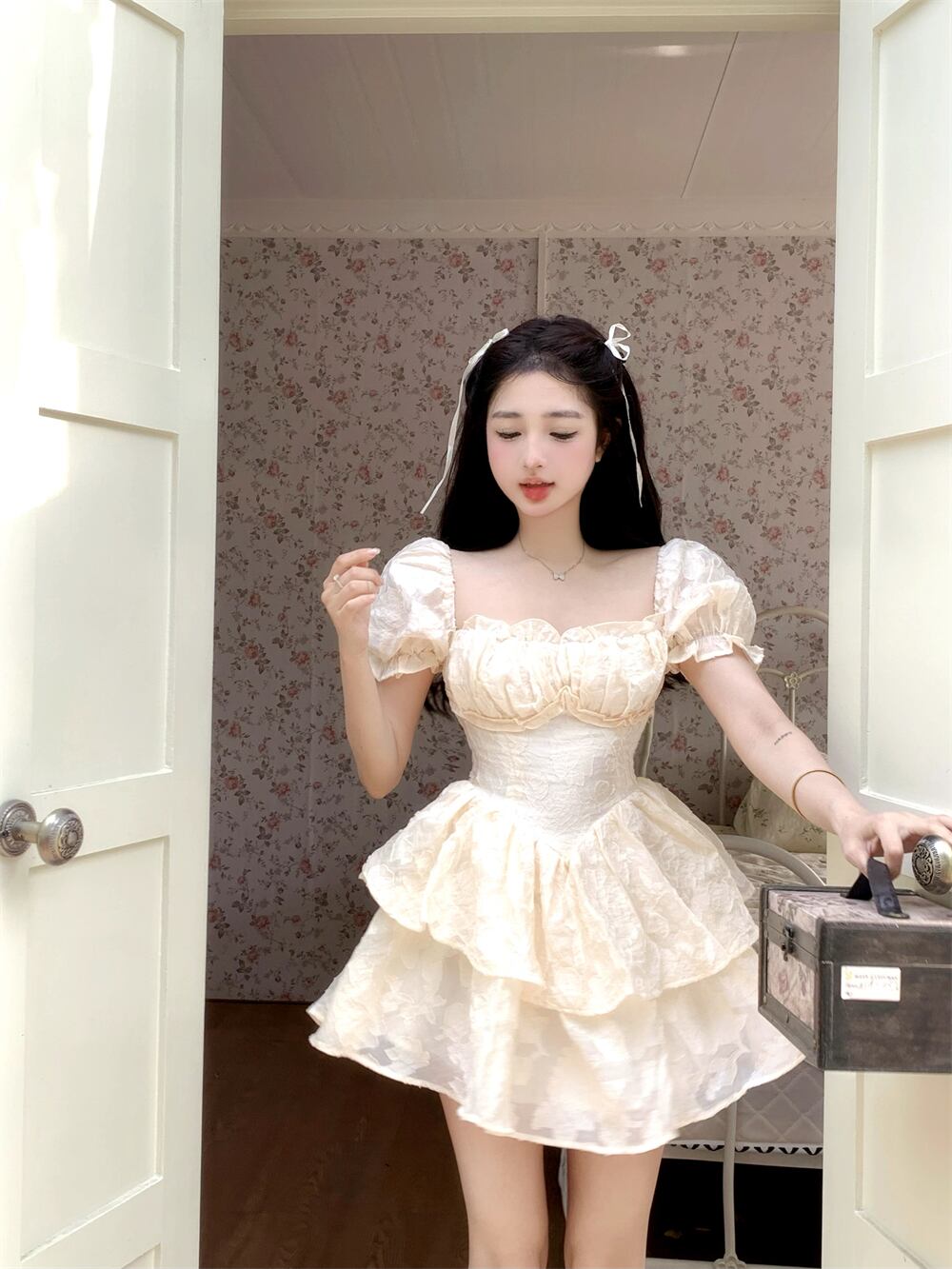 フランスの初恋プラティコドンショートスカート夏純粋な欲望セクシーなスクエアカラーパフスリーブハイウエストスリムふわふわドレス女性 ハイウェスト サマー 夏物 ピュア スクウェア nana95059163436 | modepoisson