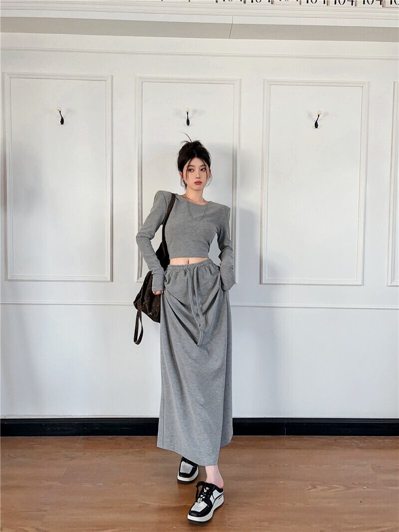 スーツスカート 2023 夏新デザインセンスニッチ長袖 tシャツハイウエスト巾着スカート女性のツーピーススーツ ハイウェスト ロング サマー 夏物 nana57212501262 | modepoisson