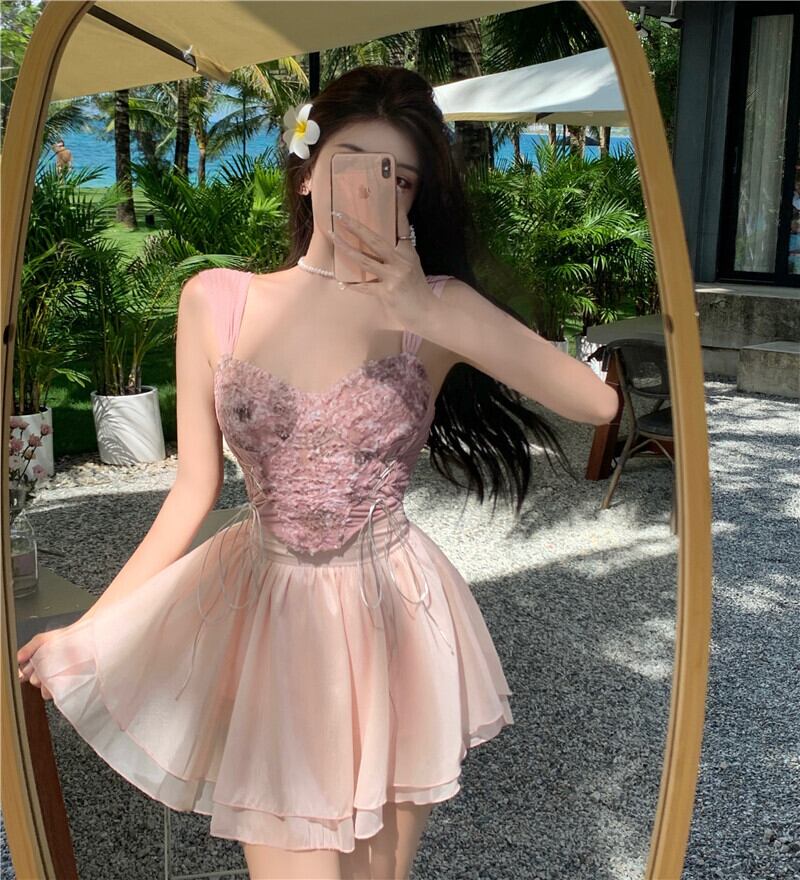 フランスの甘くてスパイシーなピンクのレースのチューブトップにキャミソール付きのハーフレングスメッシュスカート夏美乳ふふスーツ 大人ガーリー スウィート キュート カジュアル サマー 夏物 nana32540060839 | modepoisson