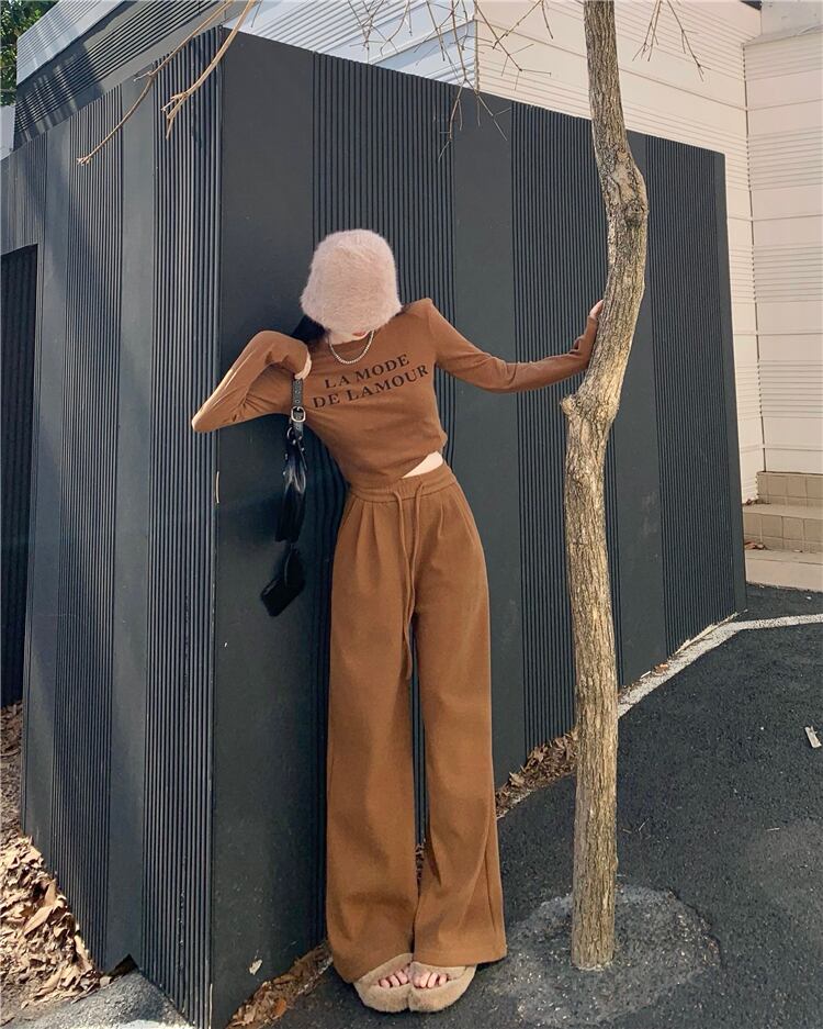 色:ブラックトップ,コーヒートップ,黒いズボン,コーヒーカラーパンツ