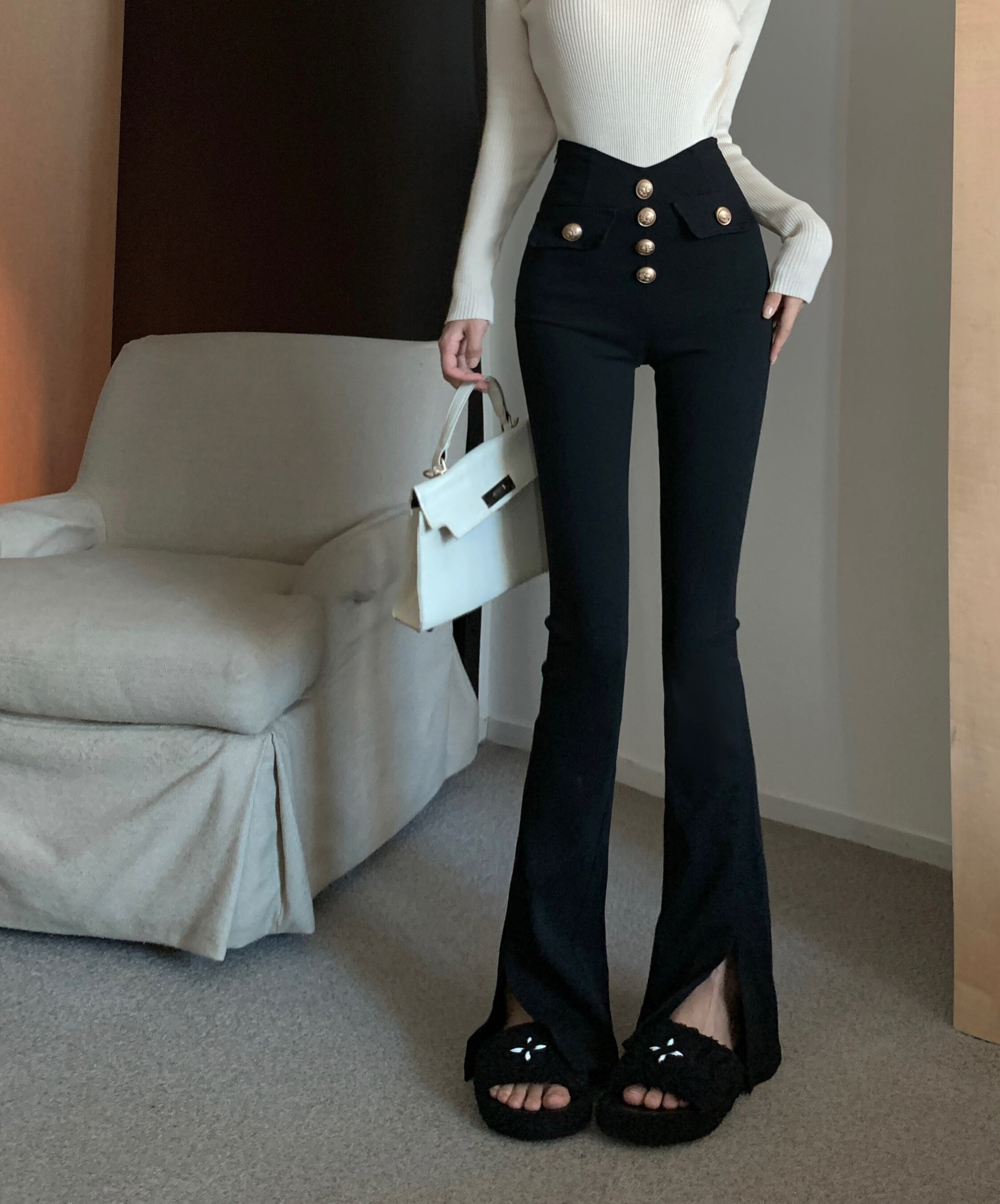 センスブレストハイウエスト弾性カジュアルパンツ 2023 春の新黒スリットマイクロフレアパンツ女性 ハイウェスト レッド ブラック エラスティック 伸縮 スプリング 春物 nana82813063161 | modepoisson