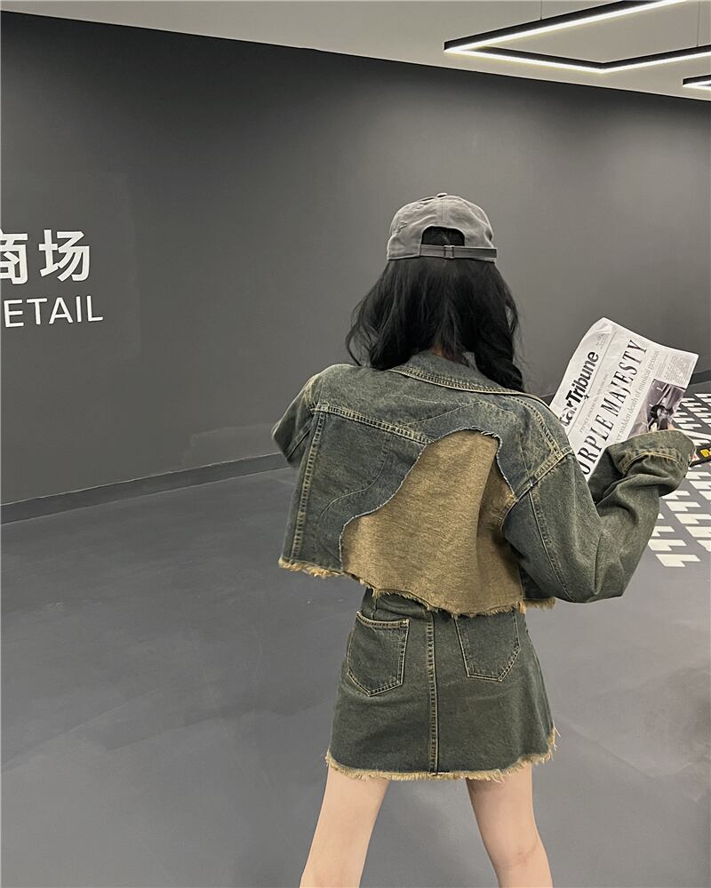 香港スタイルのレトロシックなスーツの女性の春 2023 新しいデニムショートコートハイウエストスカートファッションツーピーススーツ ハイウェスト スプリング 春物 nana14802452123 | modepoisson