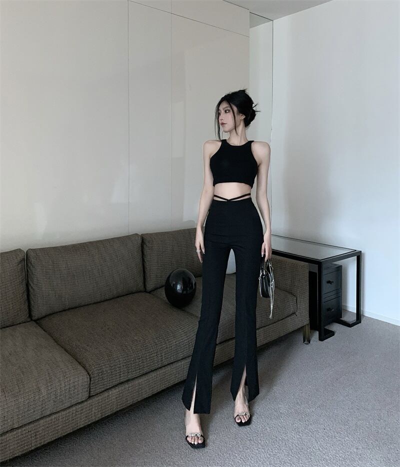 黒の少しブーツ カジュアル パンツ女性の 2023 年春の新しいデザイン センス ニッチ ワイドレッグ ハイ ウエスト スリム スリット パンツ ハイウェスト ブラック スプリング 春物 nana33556612749 | modepoisson