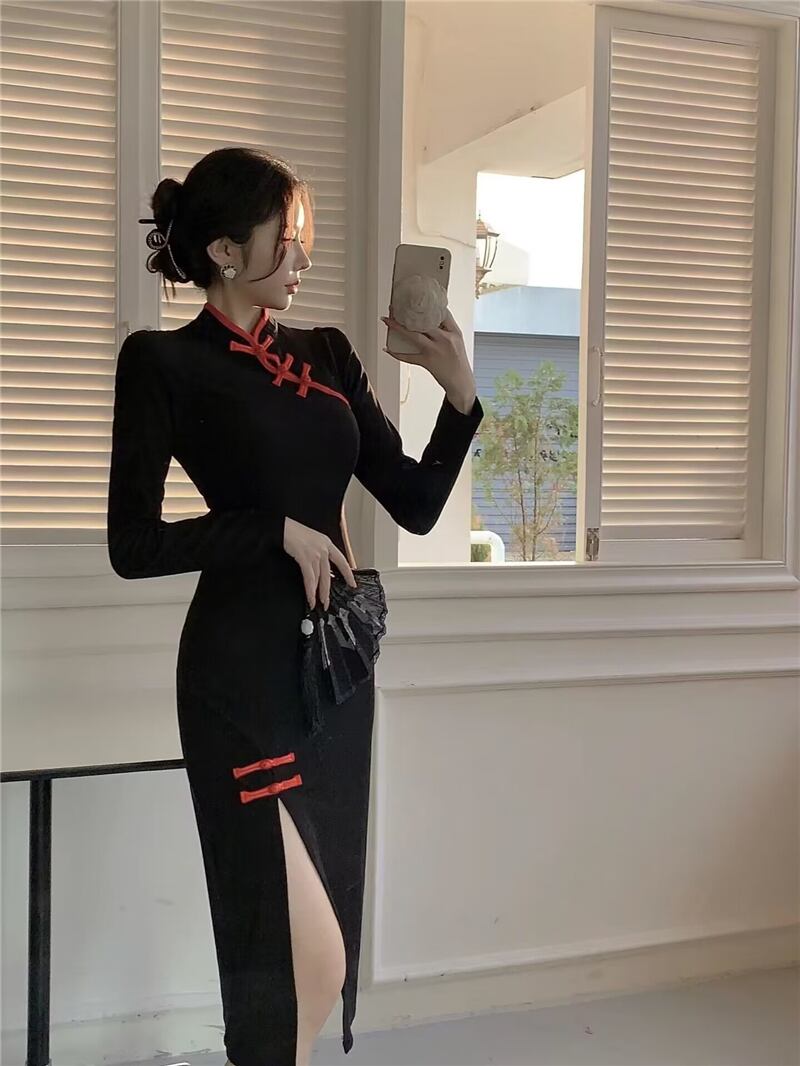 中国風の国民的スタイルのレトロな改良版のチャイナ ドレスの女性の秋と冬の有名人の気質バッグ ヒップ スリット ロング スカート オータム 秋物 ウィンター 冬物 nana98068306522 | modepoisson