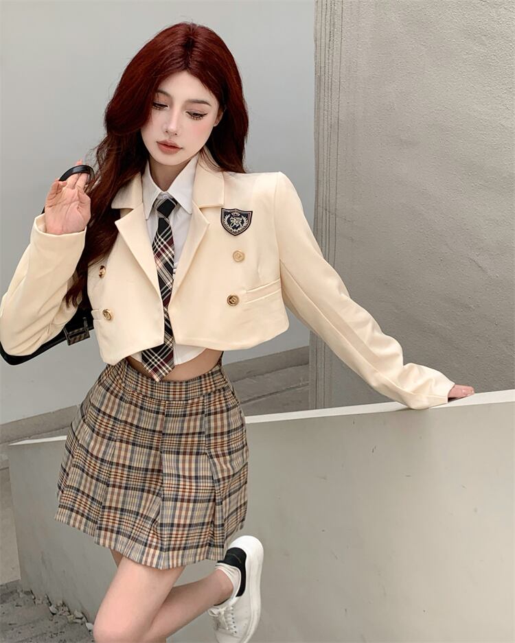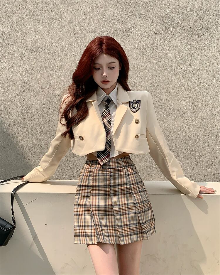 色:アプリコットスーツ,シャツ+ネクタイ,チェック柄プリーツスカート
