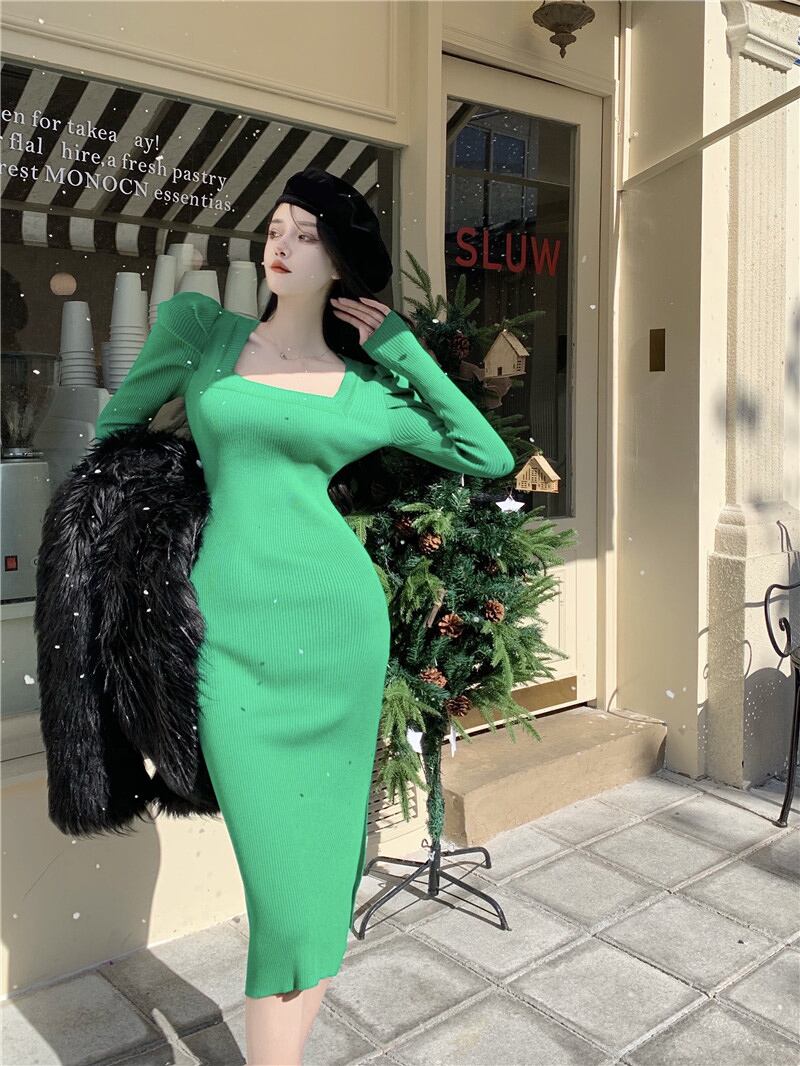 Yujie Pure Desire フレンチ パフ スリーブ ニット ドレス 2022 秋の気質スクエア ネック スカート レディース ドレス オータム 秋物 ピュア スクウェア nana29280699474 | modepoisson