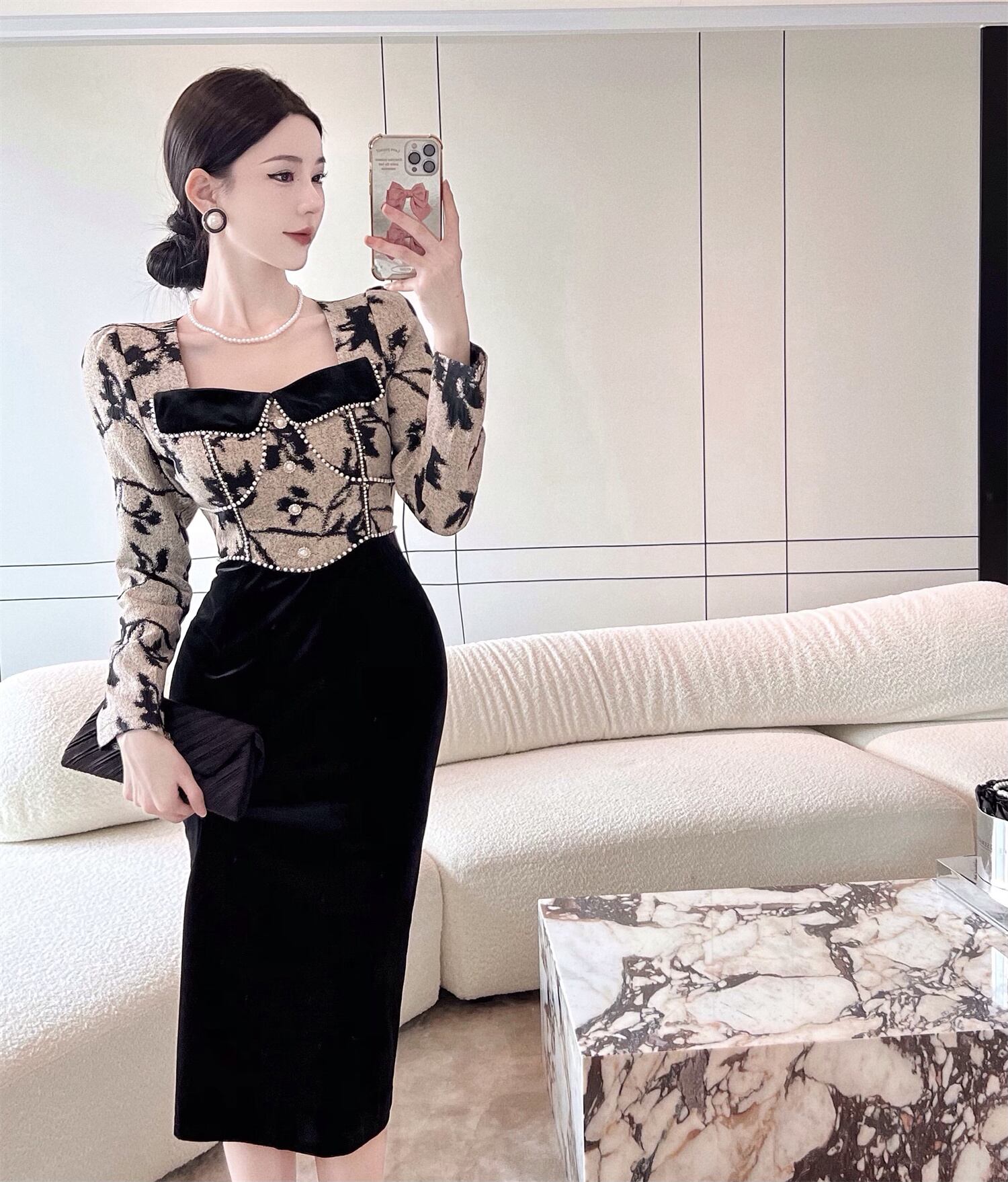 ドレスの女性の 2022 秋と冬の新しいスタイルのフレンチ気質有名人ウエスト痩身スリムバッグヒップミドル丈スカート オータム 秋物 ウィンター 冬物 nana2635392684 | modepoisson