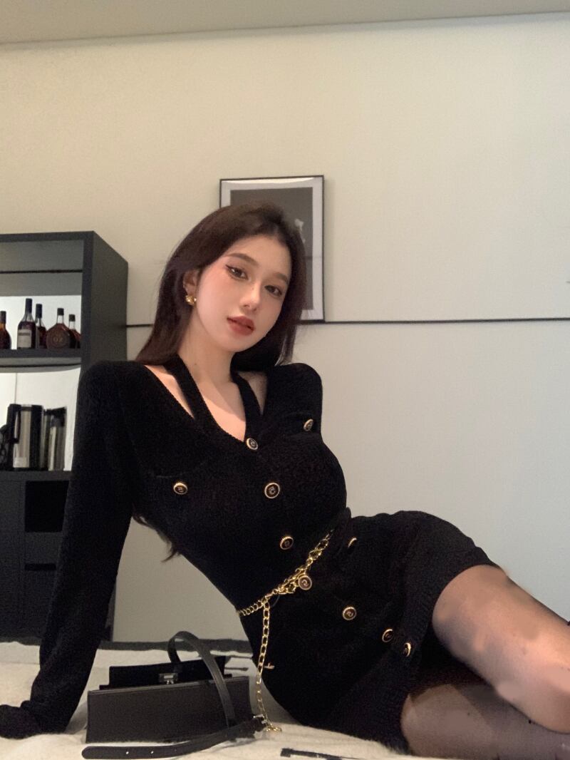 NN ナナ ~ 2023 新しいスタイルの黒の小さな香り V ネック吊り下げネック ニット バッグ ヒップ純粋な欲望ベルベット ドレス女性 ブラック Vネック ピュア nana39940611424 | modepoisson
