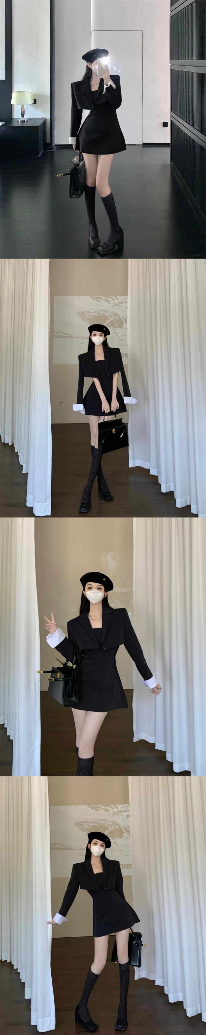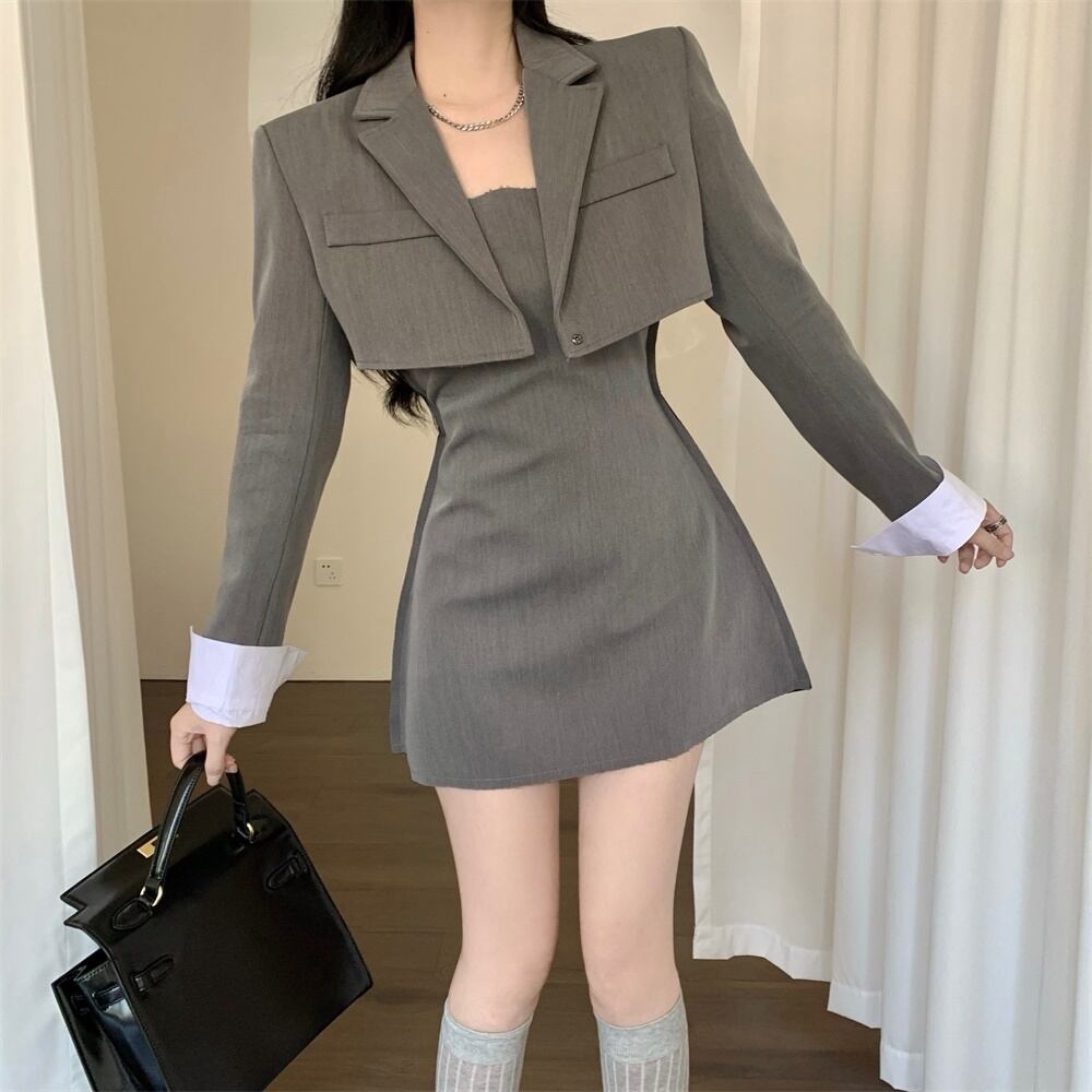 春のスーツ女性 2023 新ファッションカラーコントラスト長袖ショートスーツジャケットサスペンダードレス 2 点セット ロング スプリング 春物 nana62077261610 | modepoisson