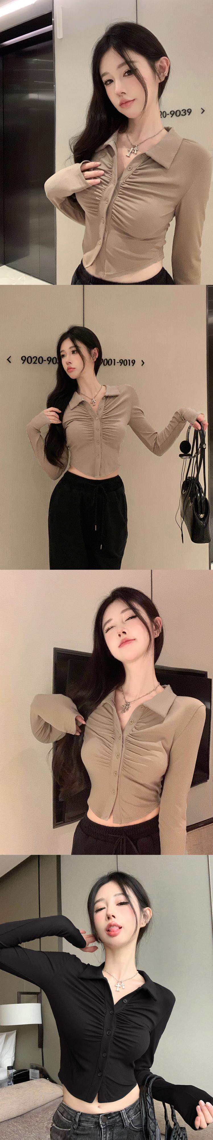 ポロカラー tシャツ 婦人服 2023 春秋新作 プリーツ スリム カーキ オールマッチ 長袖 ボトムス シャツ トップス ロング スプリング 春物 オータム 秋物 nana51305354207 | modepoisson