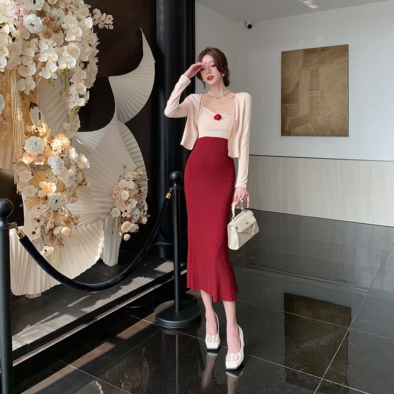 色:アプリコットソロカーディガン,独立したサスペンダースカート