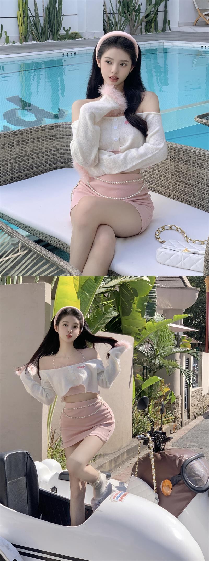 色:白いカーディガン,ピンクのサスペンダー,ピンクバッグヒップスカート