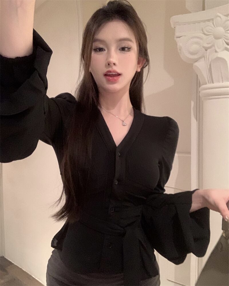 黒シャツ女性デザインセンスニッチ春 2023 新しいフレンチスタイルのシックなユニークな短い長袖トップ ショート ロング ブラック スプリング 春物 nana29188209798 | modepoisson