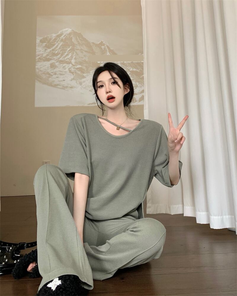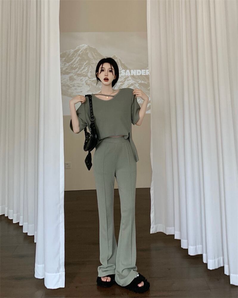 ソルトスタイルはYujieツーピーススーツ2023春の新作半袖トップハイウエストカジュアルマイクロフレアパンツ婦人服を着ています ハイウェスト レッド スプリング 春物 nana54320274845 | modepoisson
