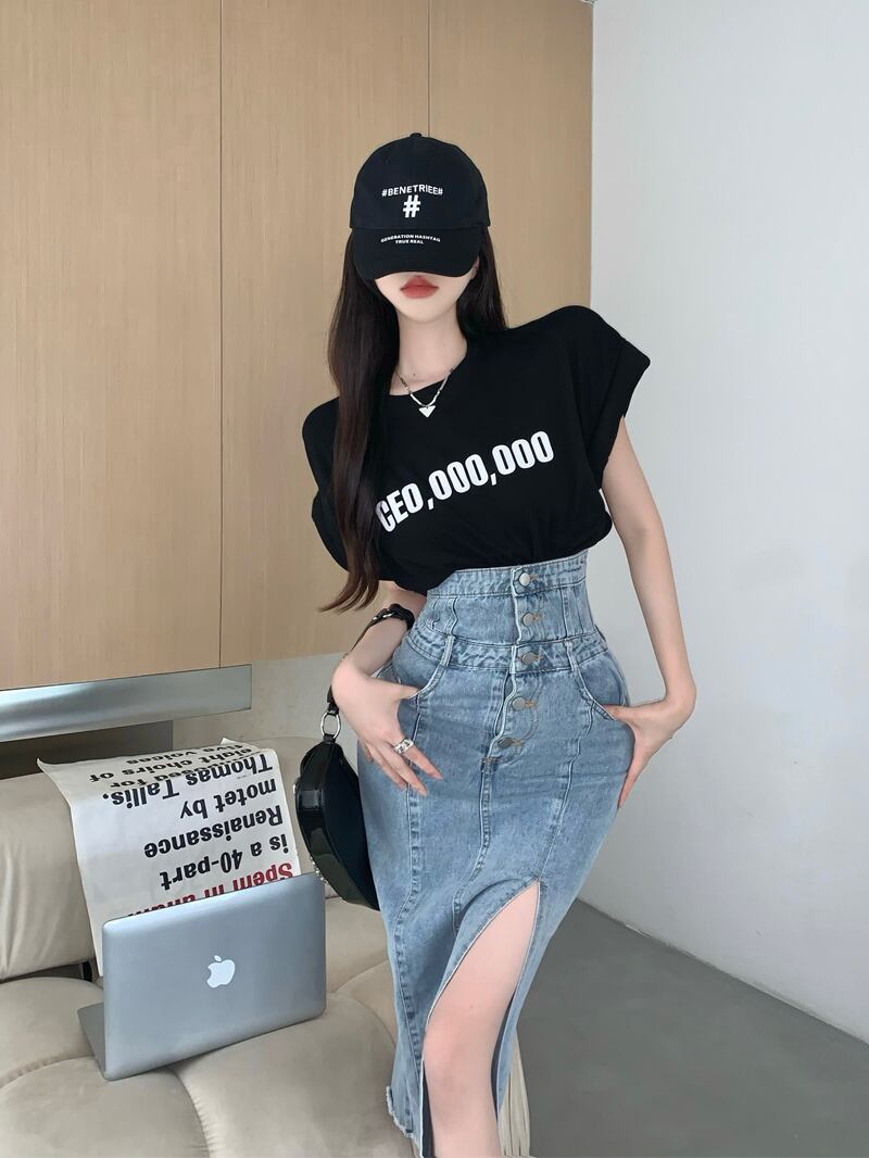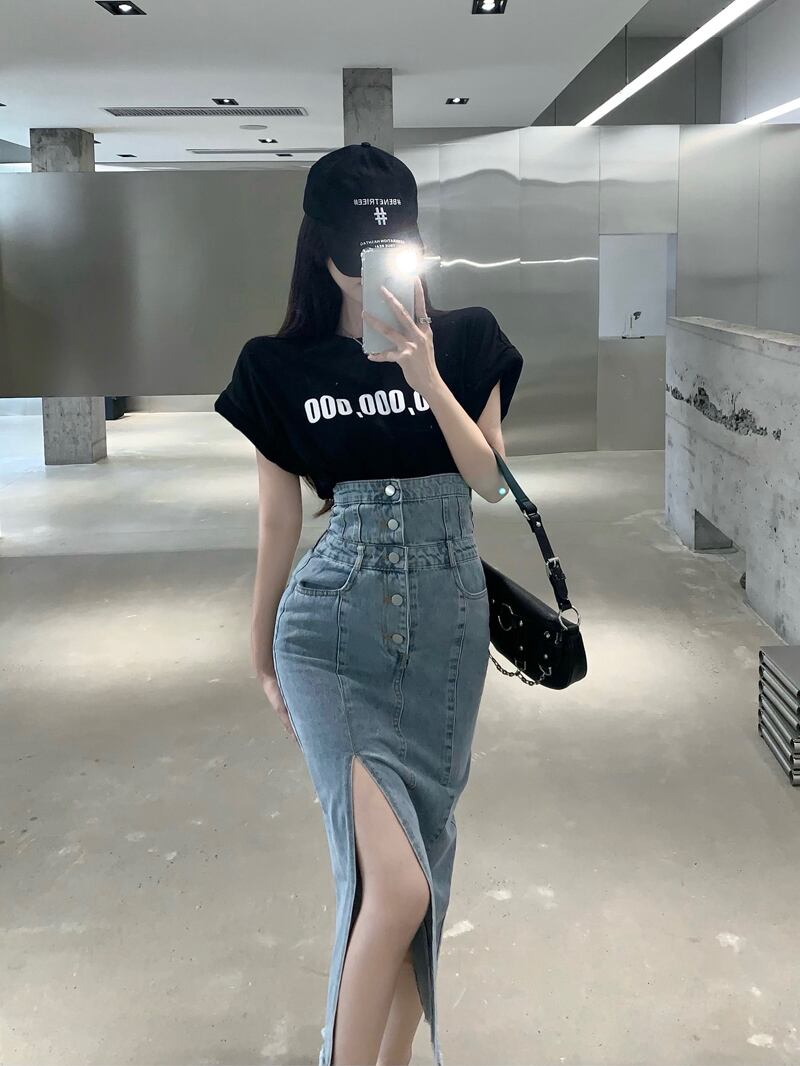 香港スタイルのスーツスカートツーピーススーツ 2023 夏の新ファッション半袖 Tシャツハイウエストバッグヒップデニムスカート女性 ハイウェスト サマー 夏物 nana19631305436 | modepoisson