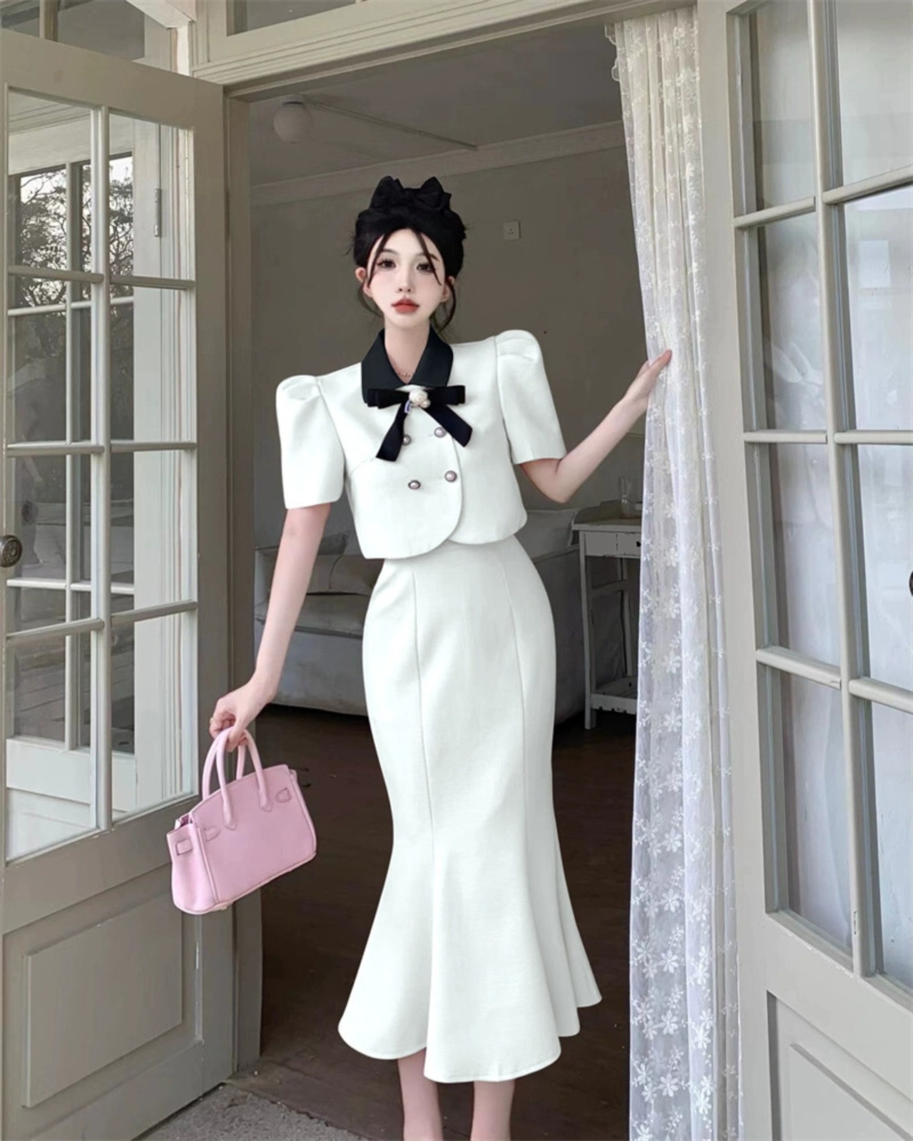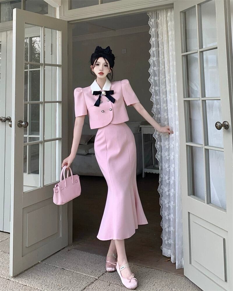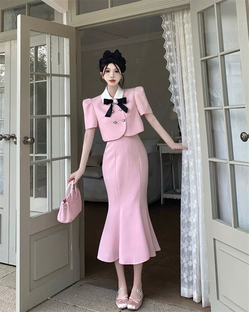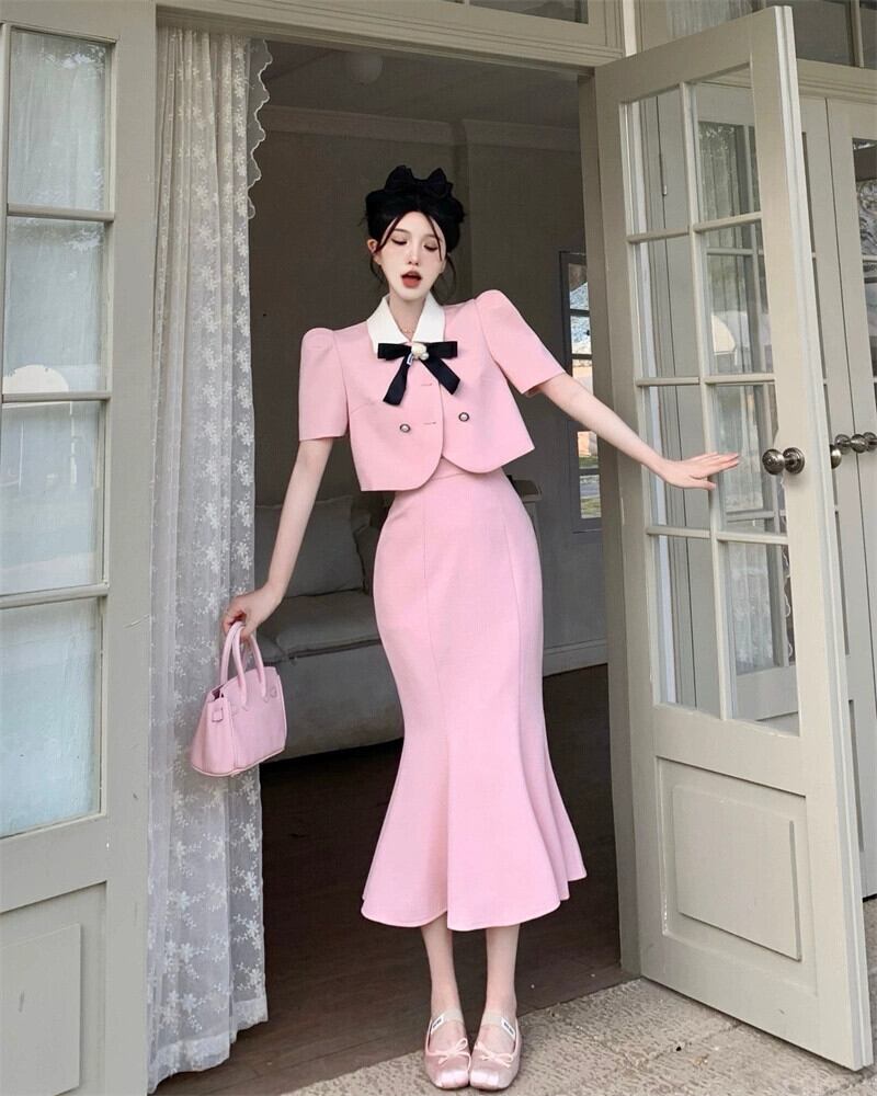 色:コサージュ付きの黒のスーツ,コサージュ付きピンクのスーツ,コサージュ付きアプリコットスーツ