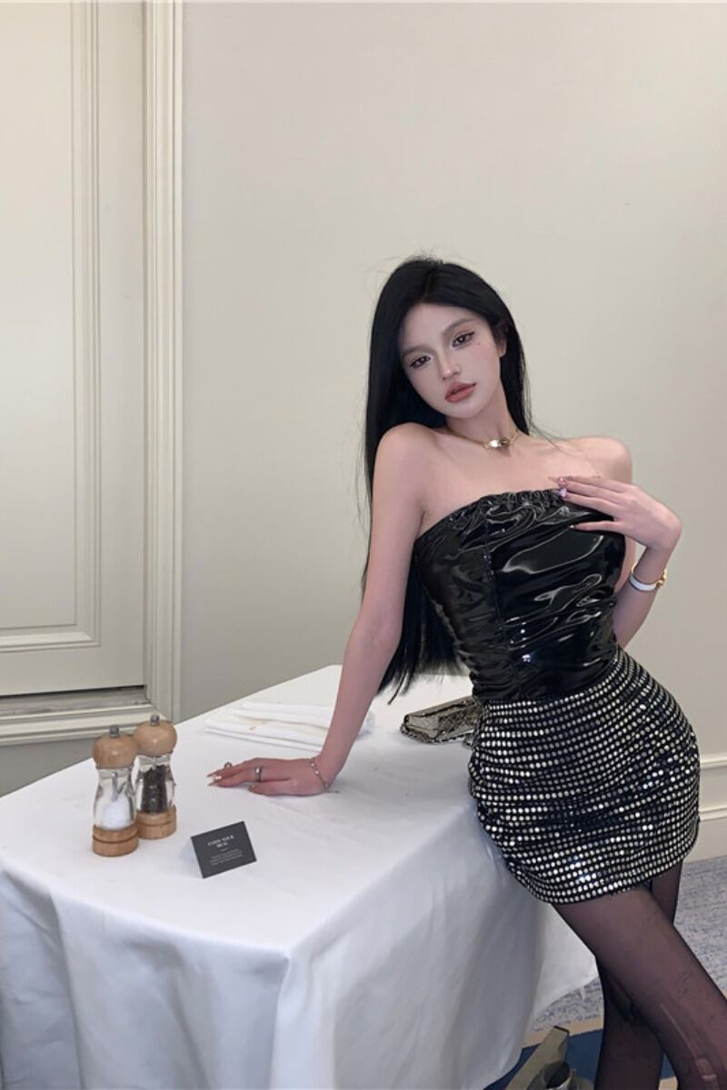 色:ブラックレザーチューブトップ,スパンコールスカート