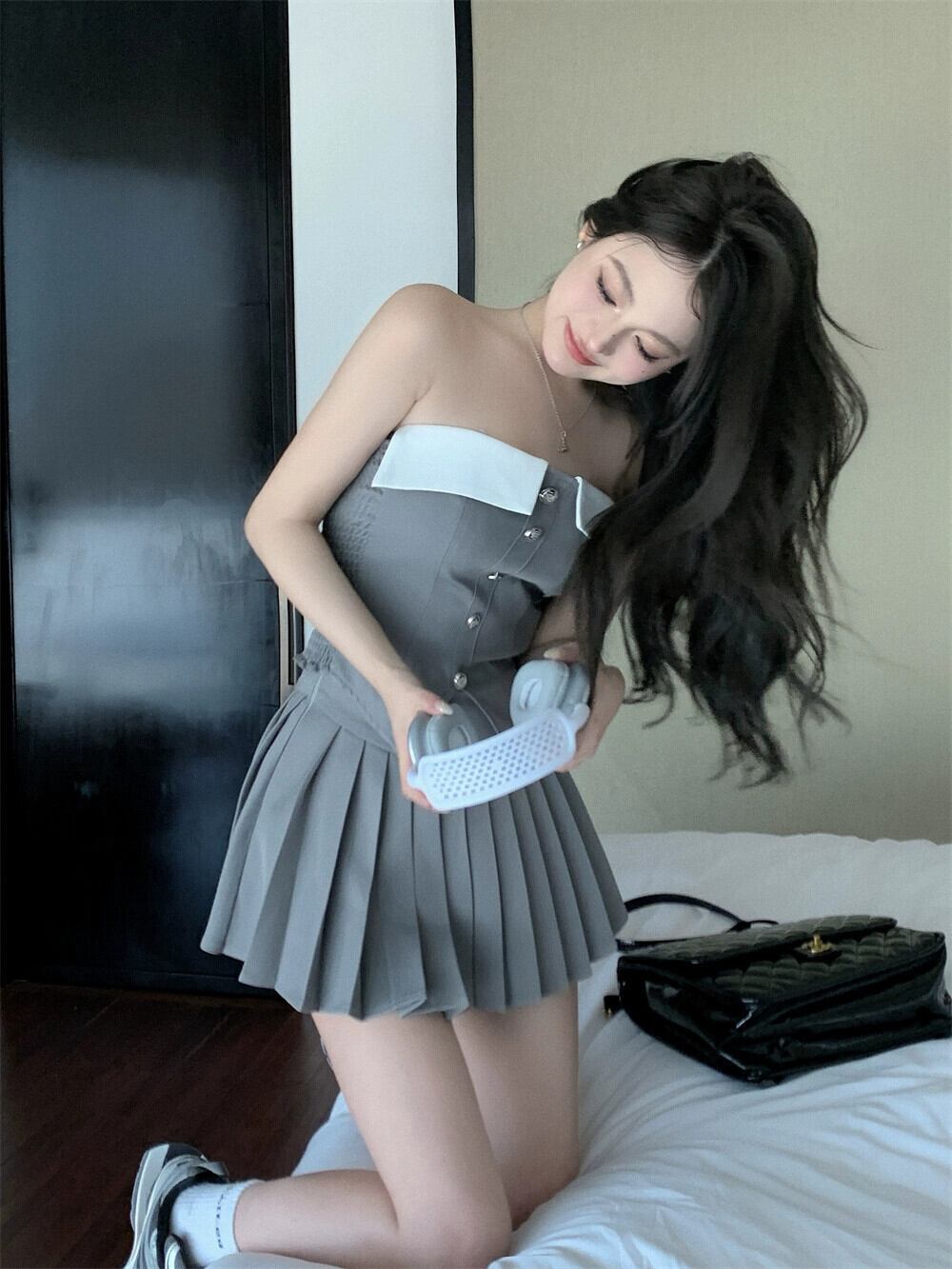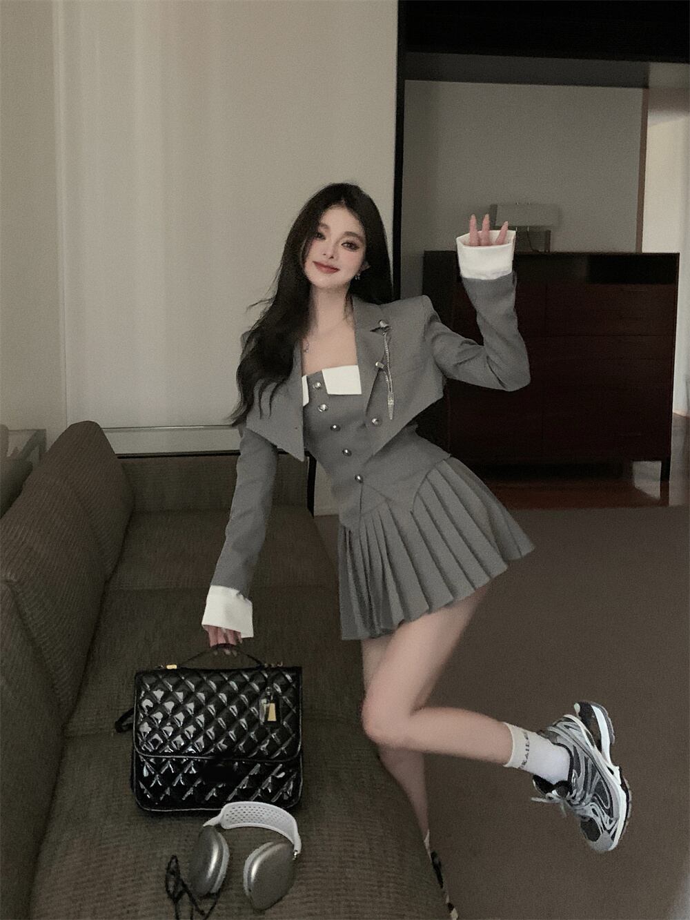 春ショートスーツジャケットセクシーなチューブトップベストハイウエストプリーツスカートドラマスリーピーススーツ女性 ハイウェスト スプリング 春物 nana4145839920 | modepoisson