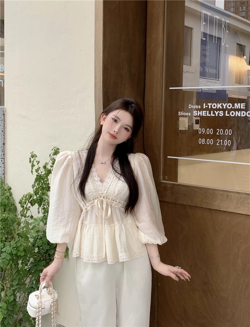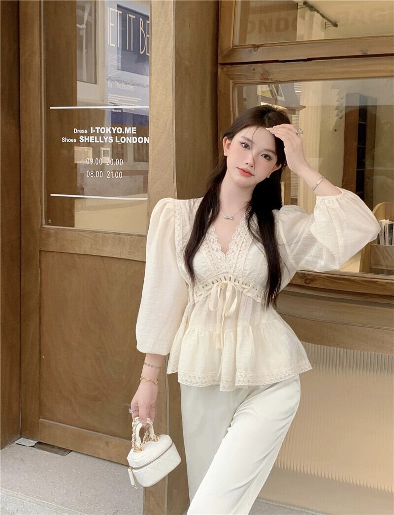 甘いスーパーフェアリーレーステンセルシャツ春の新作シックでユニークな長袖スリムVネックストラップショートトップ ロング 大人ガーリー スウィート キュート カジュアル スプリング 春物 nana34199619062 | modepoisson