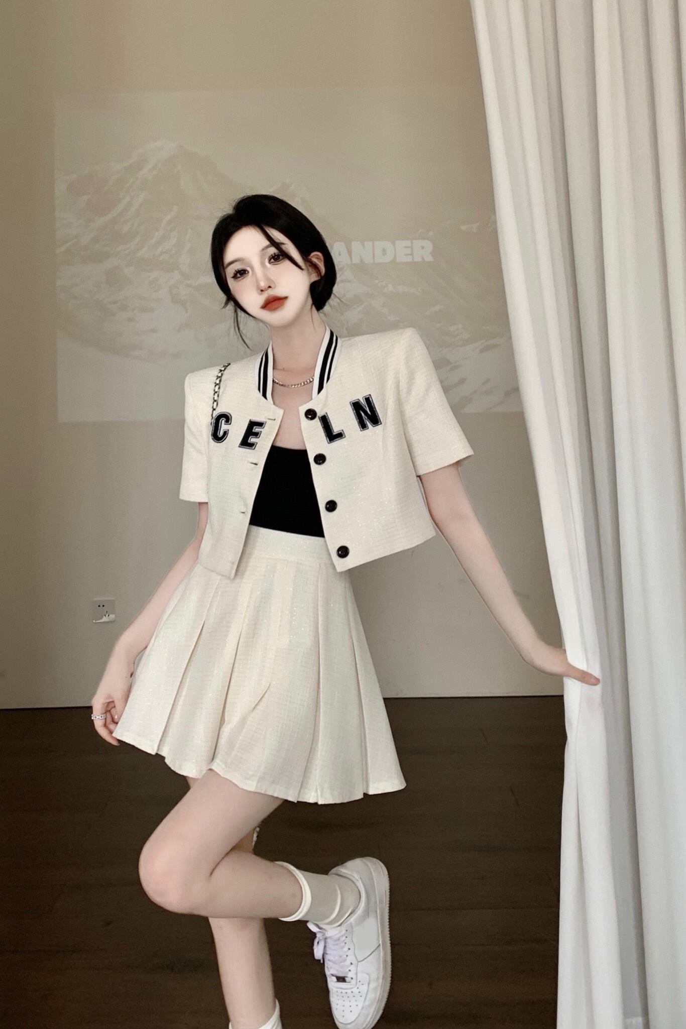 野球ユニムスーツ女性の夏の新しいショートコートハイウエストプリーツスカートカレッジスタイルカジュアルツーピーススーツ ハイウェスト サマー 夏物 nana38282678289 | modepoisson