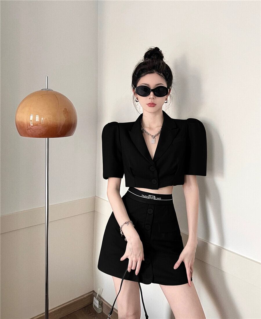 サマースーツ女性 2023 新しいパフスリーブスーツショートジャケットハイウエストスカートネットレッドフライストリートツーピーススーツ ハイウェスト 夏物 nana34431575063 | modepoisson