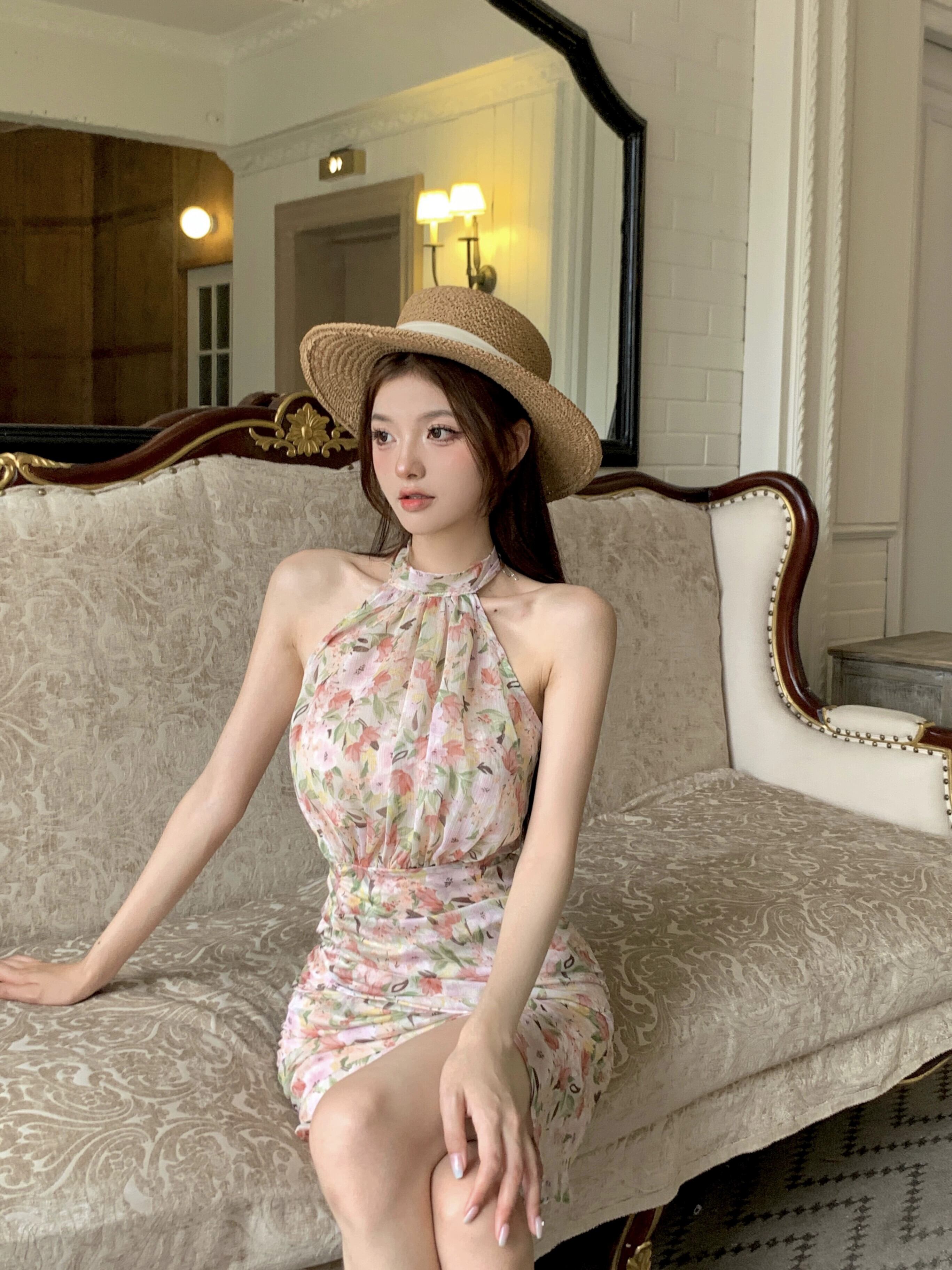 フランスの気質、純粋な欲望、高級花柄ドレス、女性の夏、スリムウエスト、サスペンダー、シフォンとヒップのショートスカート サマー 夏物 ピュア nana90615850629 | modepoisson