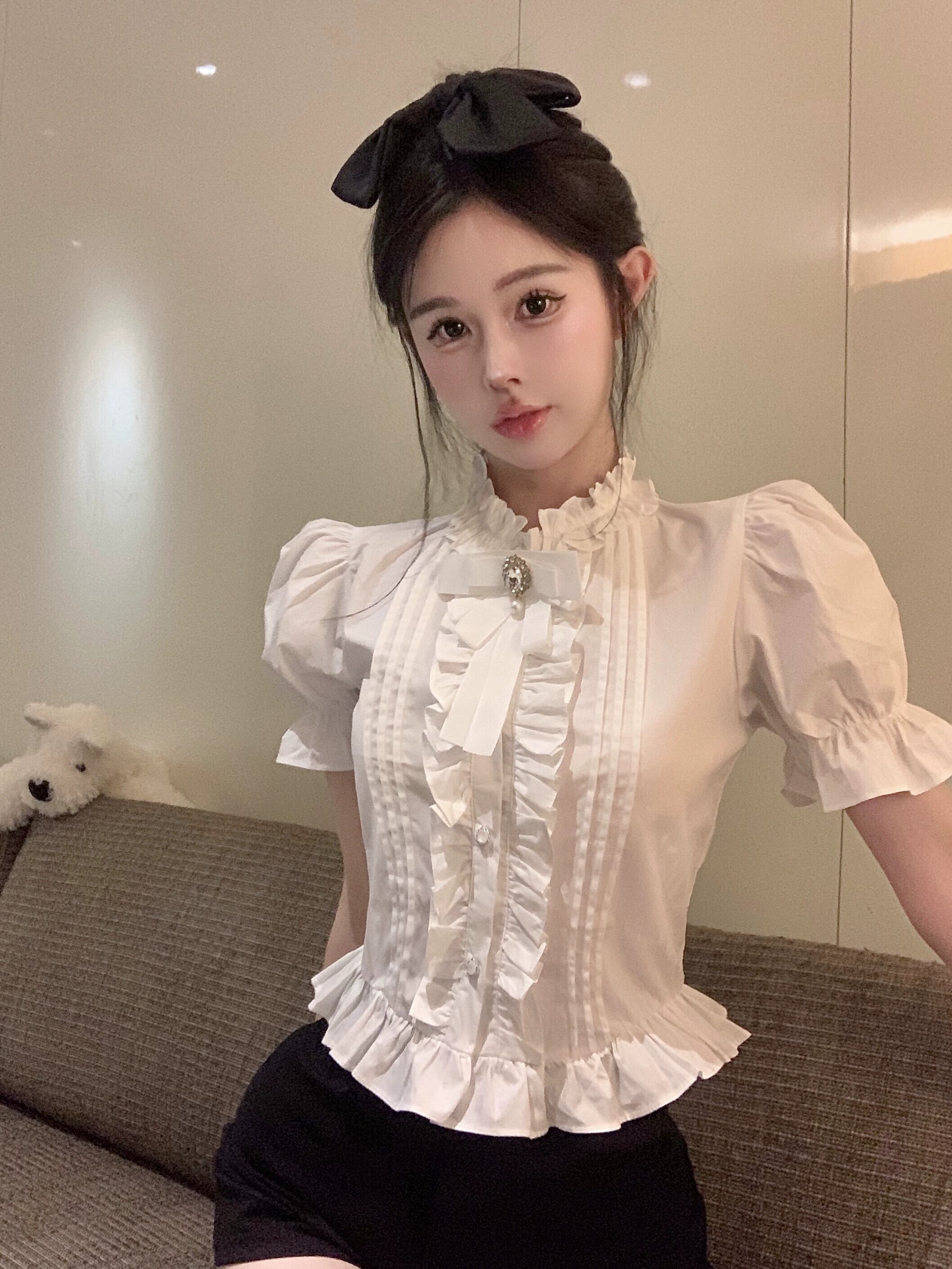 甘いカレッジスタイル半袖シャツ夏デザインセンスニッチフレンチリボンスリムシャツホワイトトップ女性 大人ガーリー スウィート キュート カジュアル サマー 夏物 nana28603051007 | modepoisson