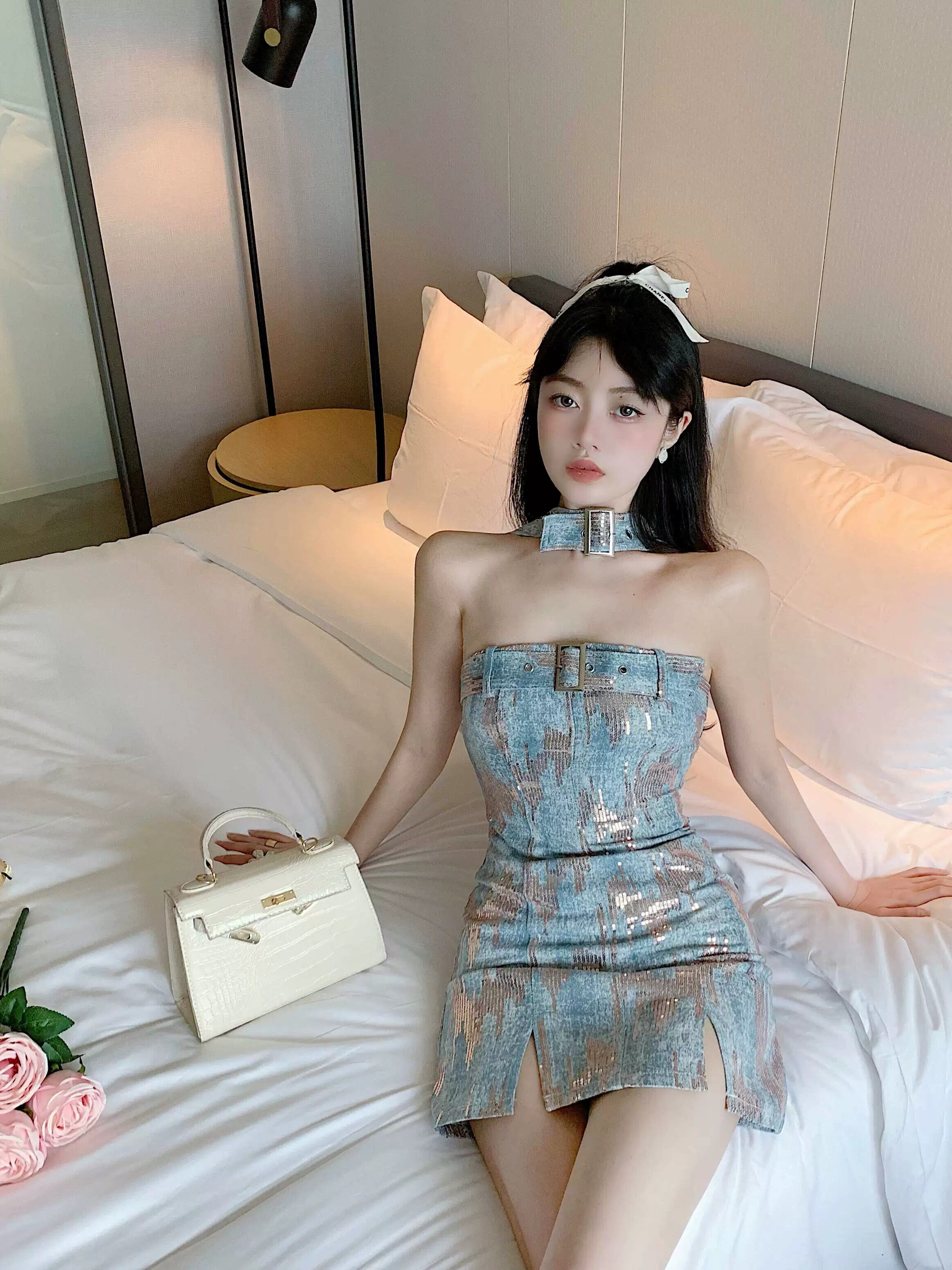 デニムチューブトップドレス夏フレンチニッチ気質セクシーなウエスト甘いぶら下げネックバッグヒップショートスカート女性 大人ガーリー スウィート キュート カジュアル サマー 夏物 nana19371815339 | modepoisson